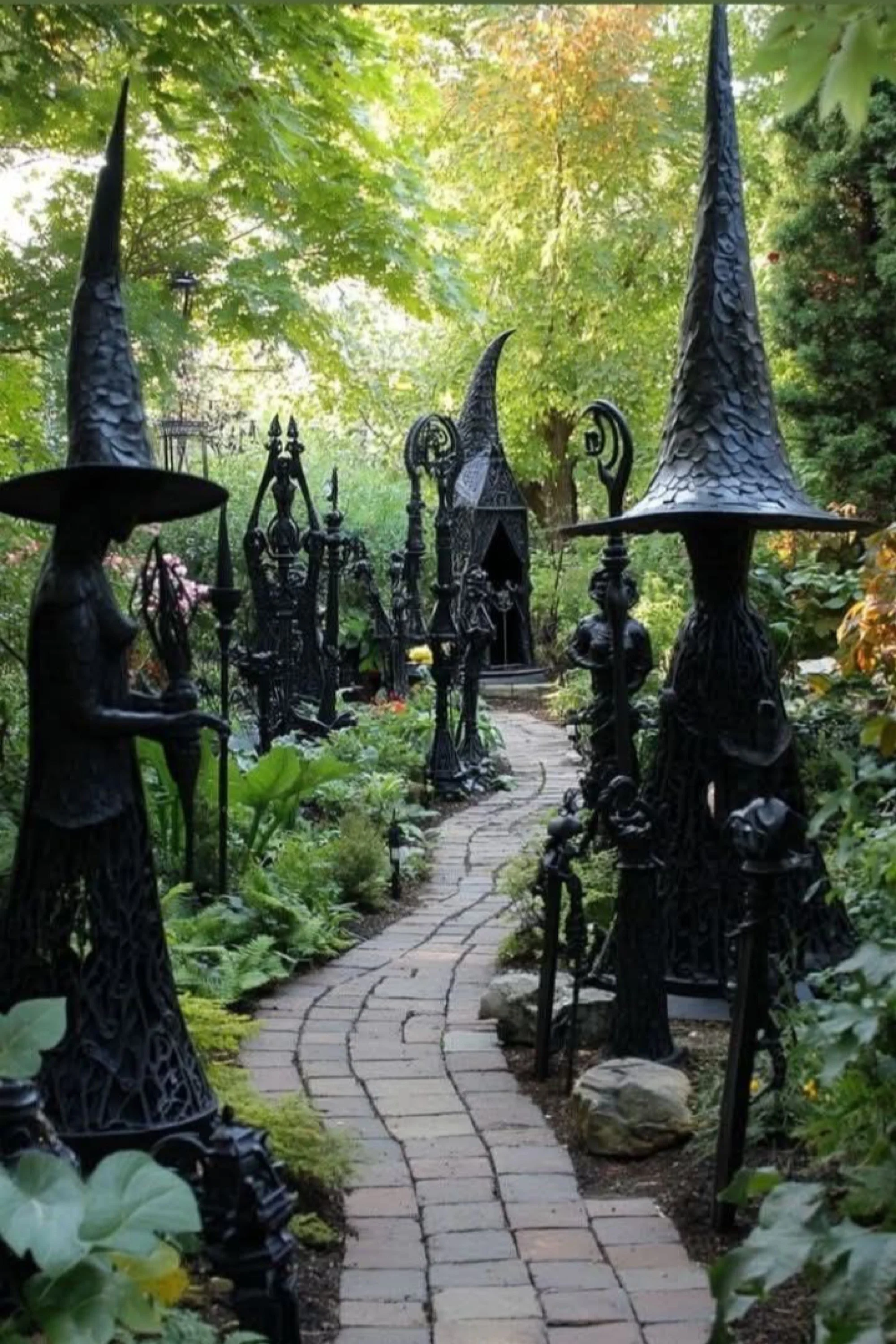 The brick path wound like a whispering serpent between towering black witch statues, their hats stabbing the air like accusations. Each held a staff, as if mid-incantation, frozen in eternal watch. Ivy tangled at their feet, and somewhere in the green above, a raven croaked like it knew a secret.