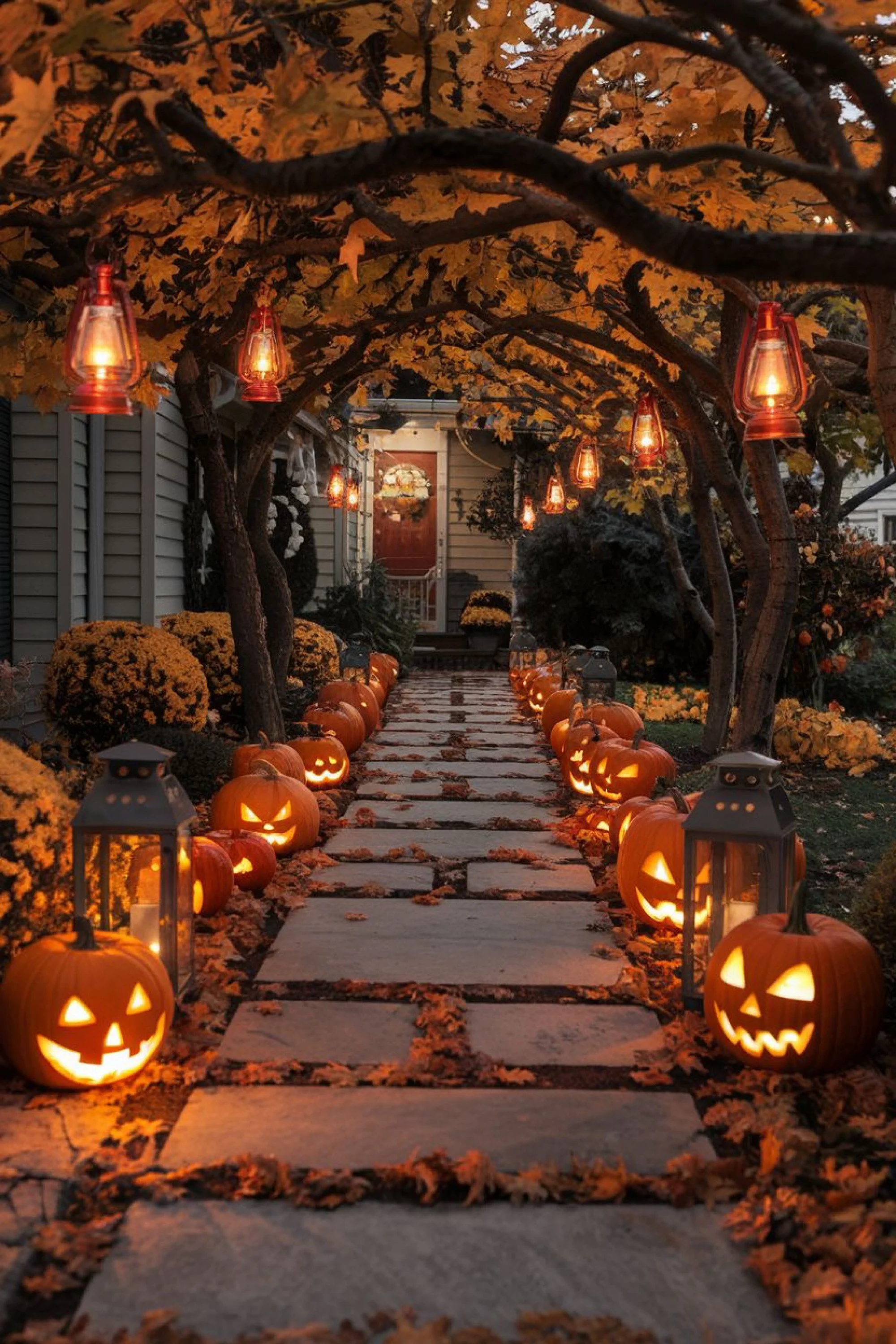 The path here curved like a ribbon, disappearing into shadows lit only by the flicker of a hundred jack-o’-lantern smiles. Each grin was different — some crooked, some needle-sharp, some so wide it was as if they’d split themselves open just to watch you squirm. They sat in clusters along the cracked stone walkway, pressed between twisting wooden arches wrapped in creeping vines. Overhead, smaller pumpkins dangled like fruit, their tiny faces glowing in the dark canopy.