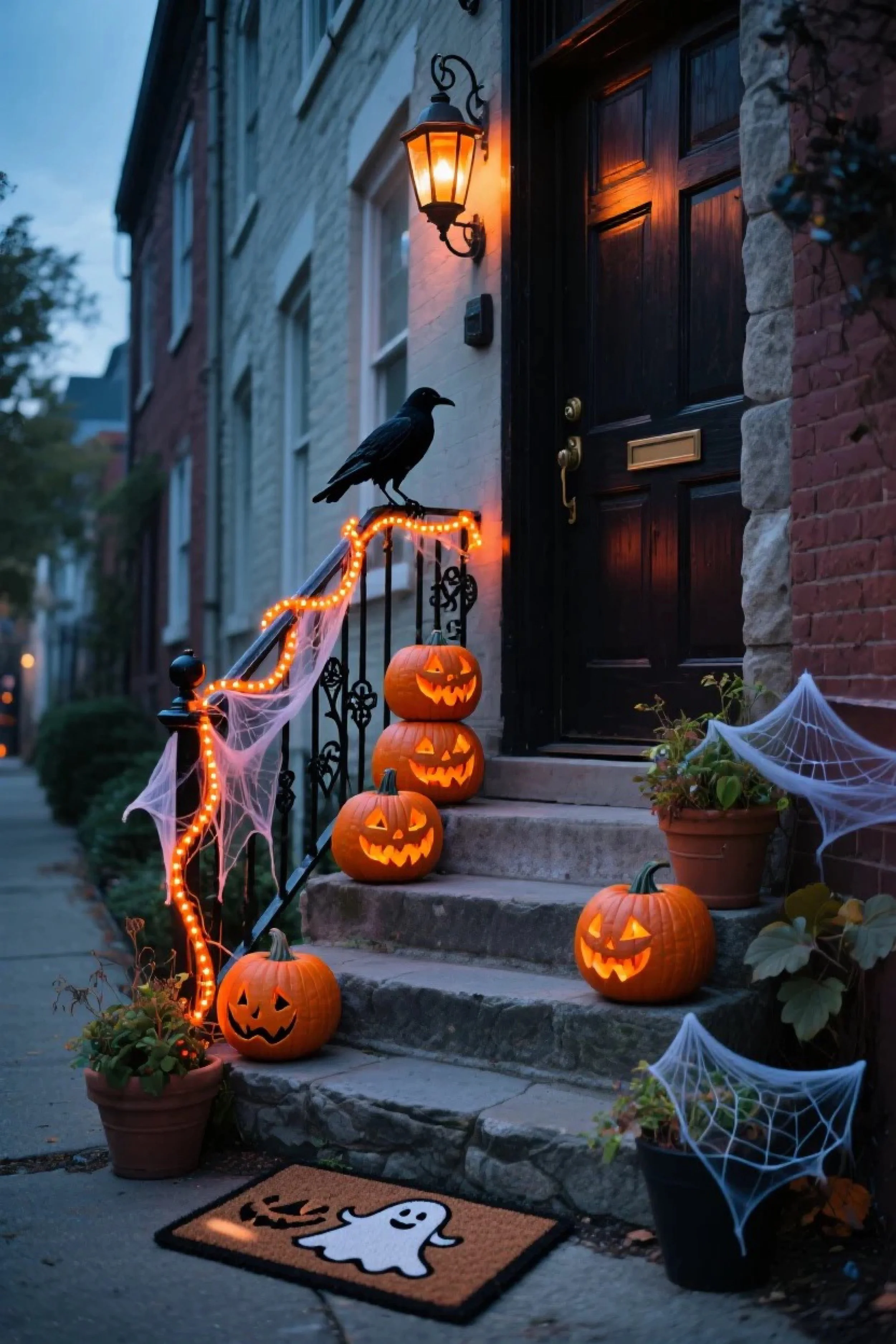 - Balance Spooky with Friendly — Pair eerie elements like ravens and spiderwebs with approachable ones like smiling pumpkins or fun doormats.