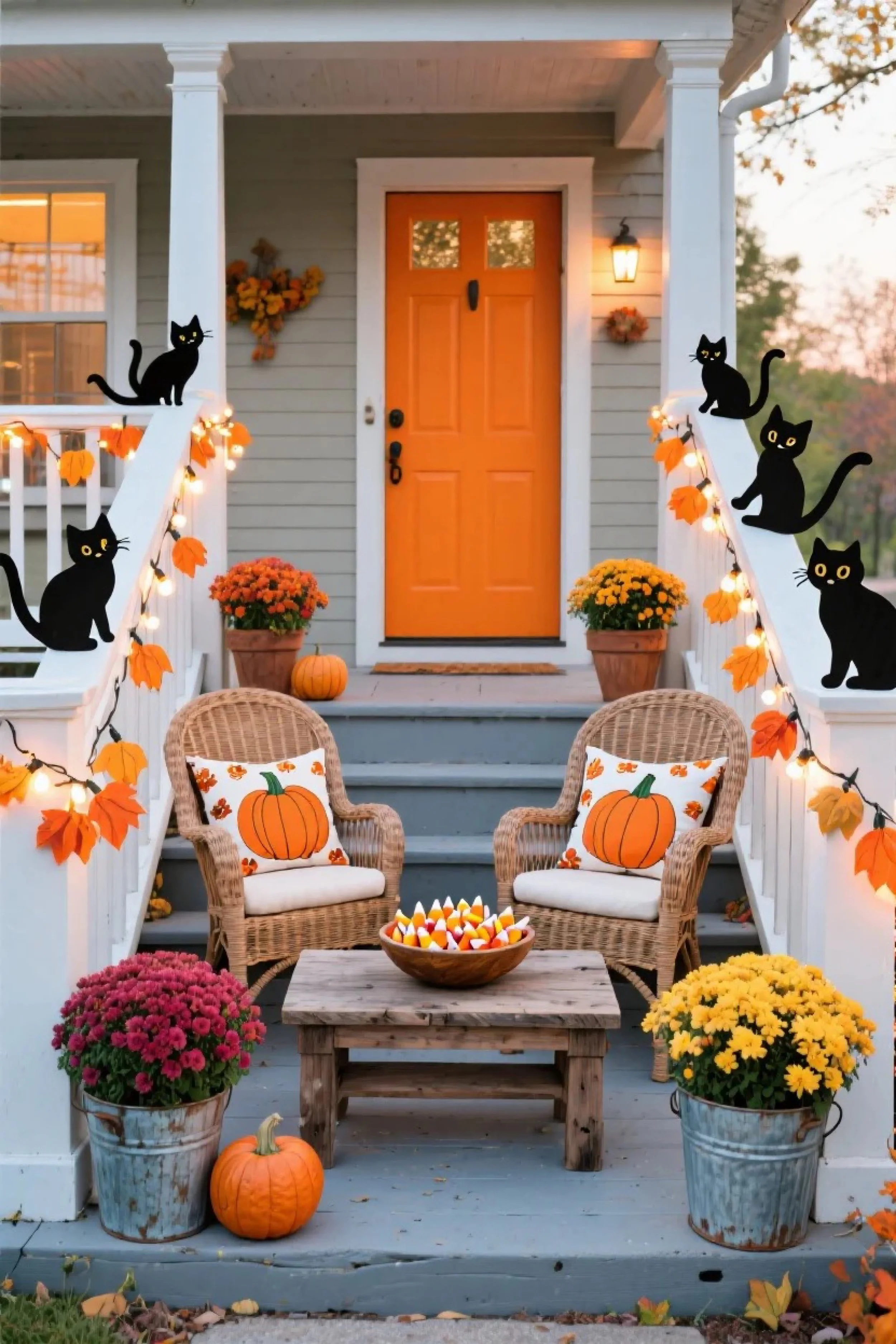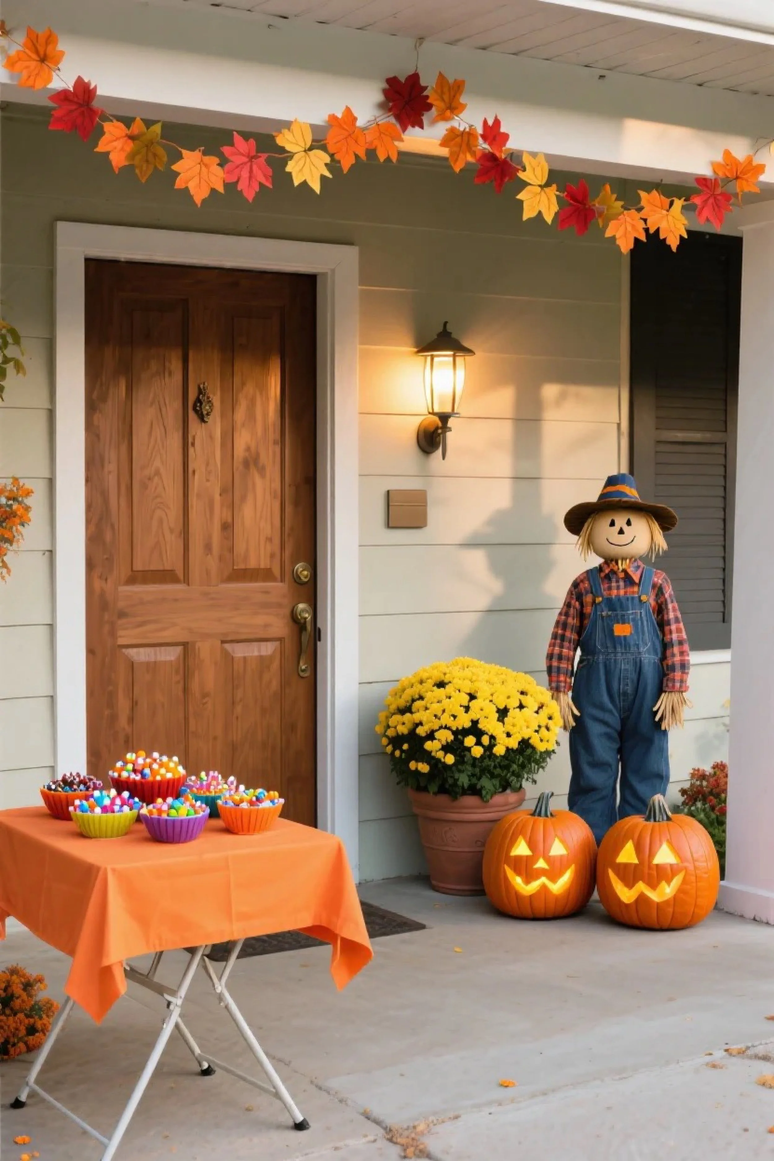 Overhead, a garland of faux maple leaves in shades of red, orange, and yellow runs across the porch beam. The garland’s vibrant colors echo the candies on the table and the mums below, unifying the palette from top to bottom. The warm light from the wall-mounted lantern beside the door casts a soft glow over the setup, ensuring it’s just as inviting after sunset.