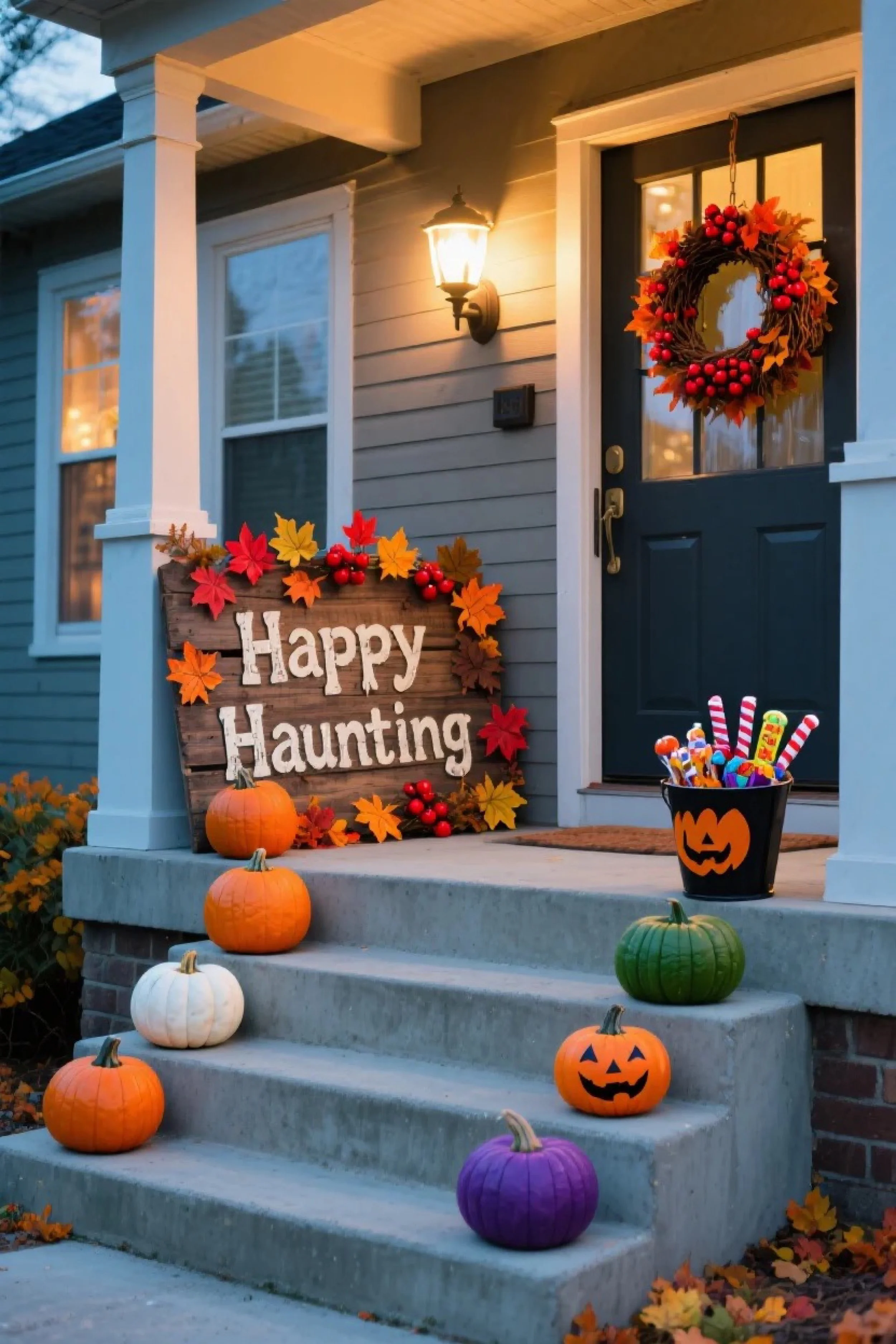 This bright and cheerful Halloween porch greets visitors with a friendly invitation rather than a fright. Anchoring the design is a rustic wooden sign propped against the corner of the steps, boldly declaring “Happy Haunting” in playful white lettering. The sign is framed with a cascade of faux autumn leaves in vivid reds, oranges, and yellows, interspersed with small clusters of red berries that add texture and visual interest.