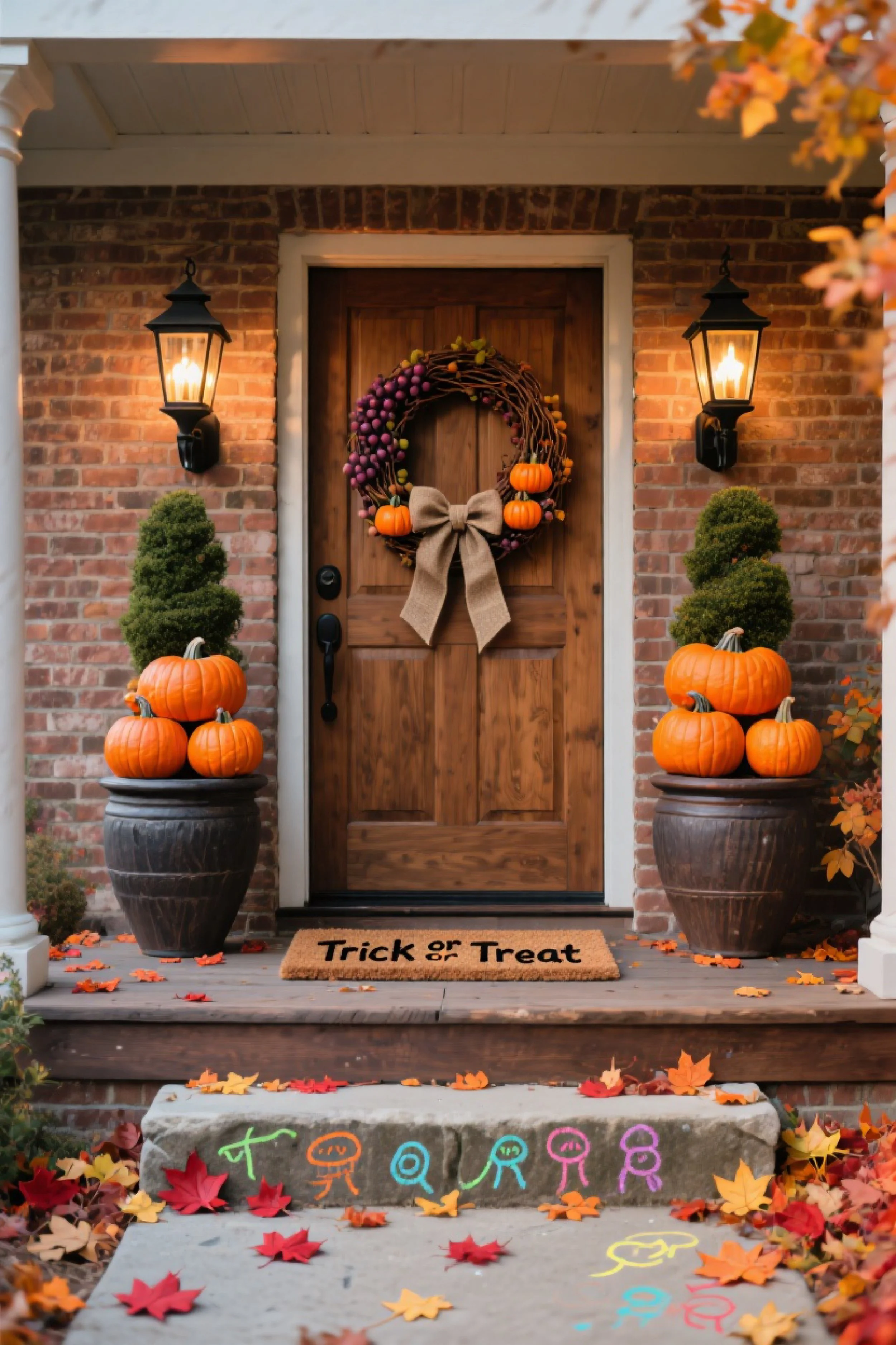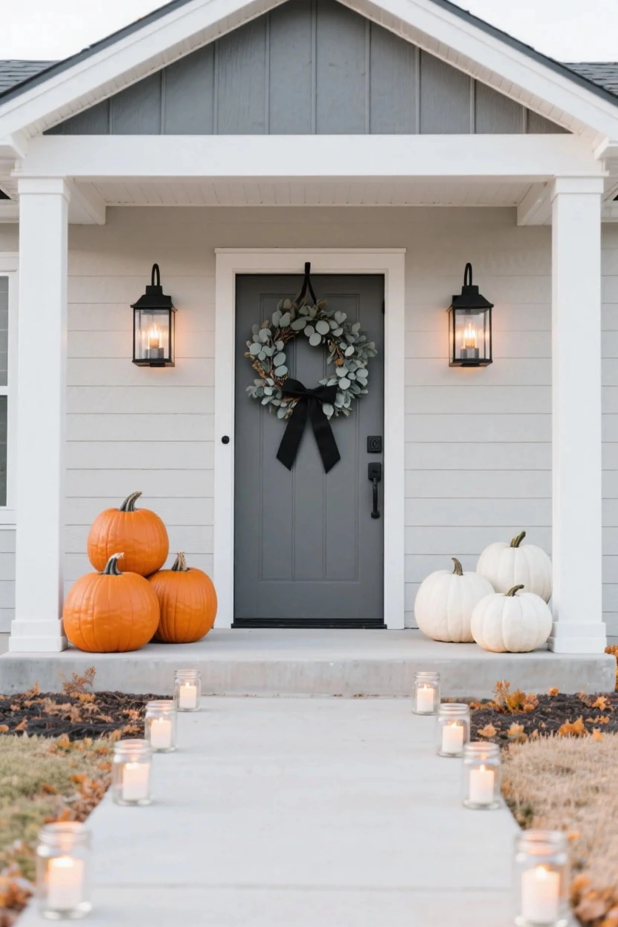 This front porch proves that Halloween décor can be both festive and elegantly understated. The design centers around a perfectly balanced composition: three classic orange pumpkins stacked neatly on one side of the door and three crisp white pumpkins arranged symmetrically on the other. Their uncarved, natural beauty keeps the look sophisticated while still honoring seasonal tradition.