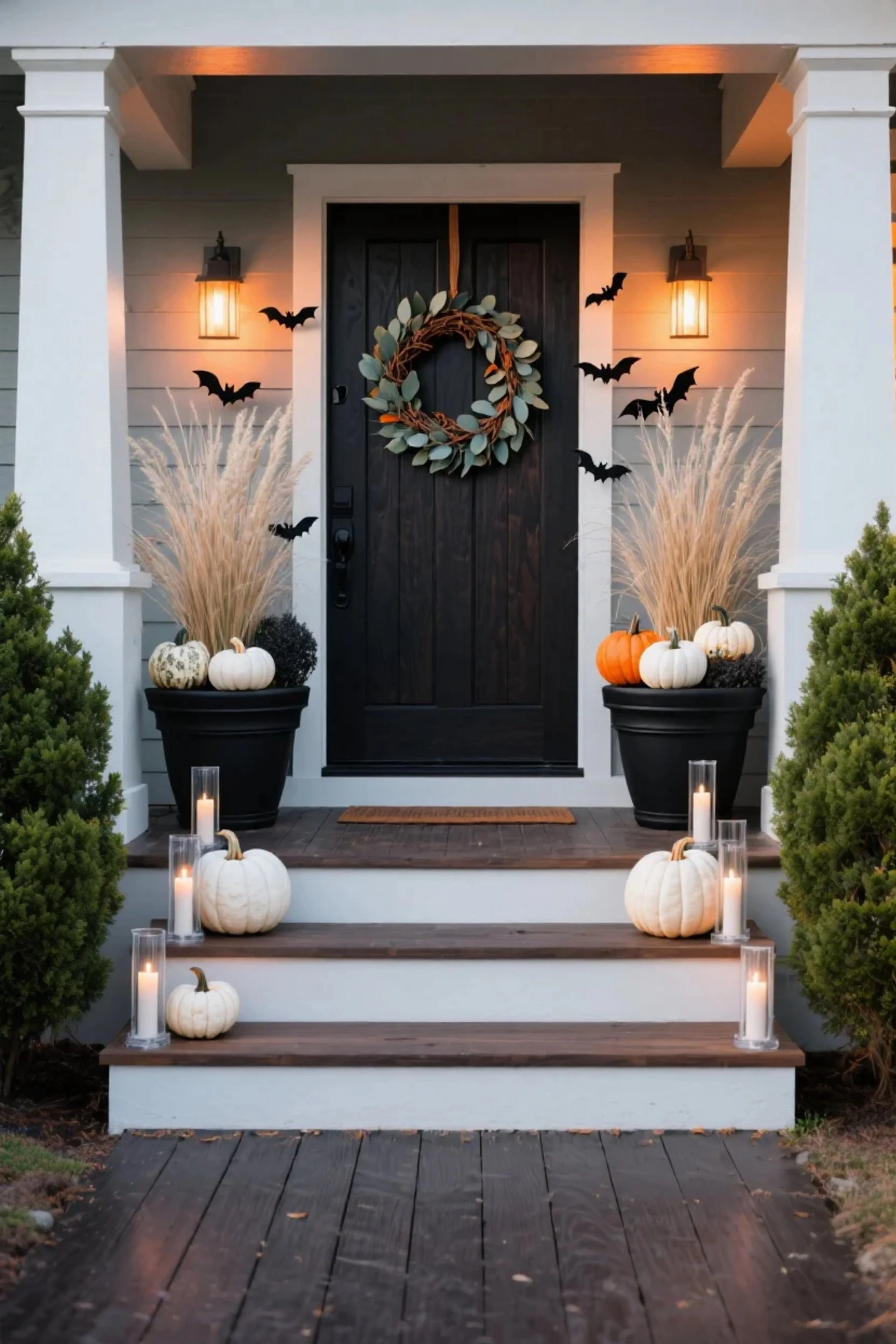- Balance Symmetry and Movement — Planters, wreaths, and candle placement create a sense of order, while bats and pampas grass introduce flow.