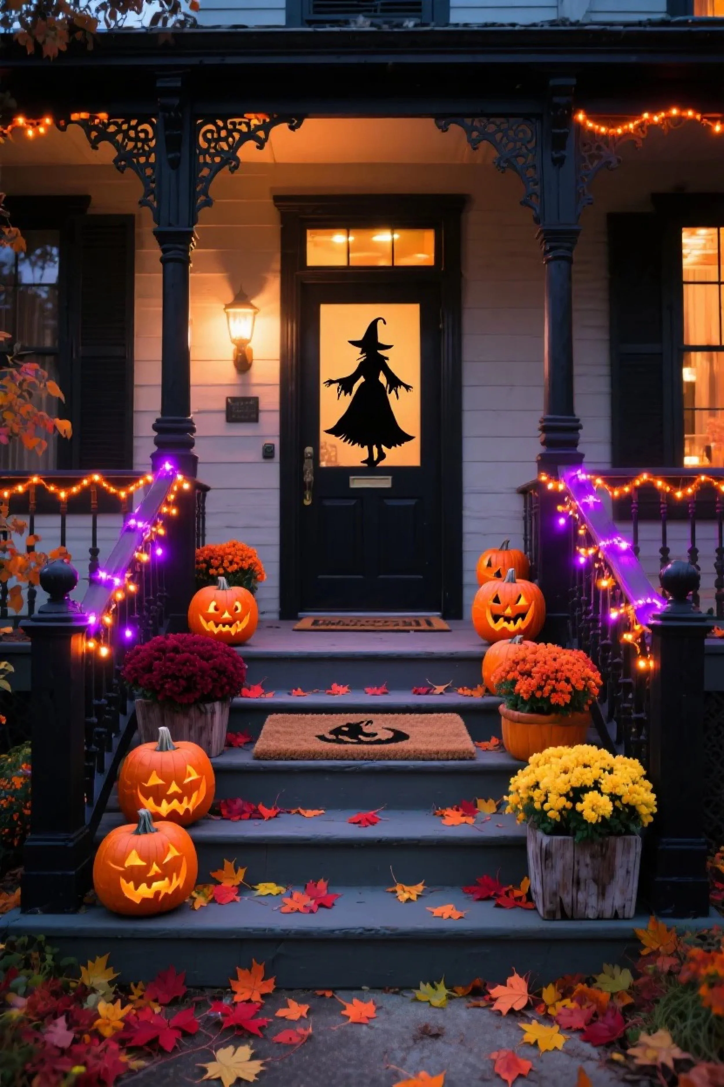 This scene captures the essence of classic Halloween charm with a twist of elegance. At first glance, the focal point is the striking black silhouette of a witch, poised mid-step, set against the warm amber glow of the front door. Her whimsical hat and outstretched arms hint at playful mischief, immediately establishing the home’s magical theme. The symmetry of the setup draws the eye from the top railings adorned with cascading strings of purple and orange lights, down to the meticulously carved jack-o’-lanterns lining each step.