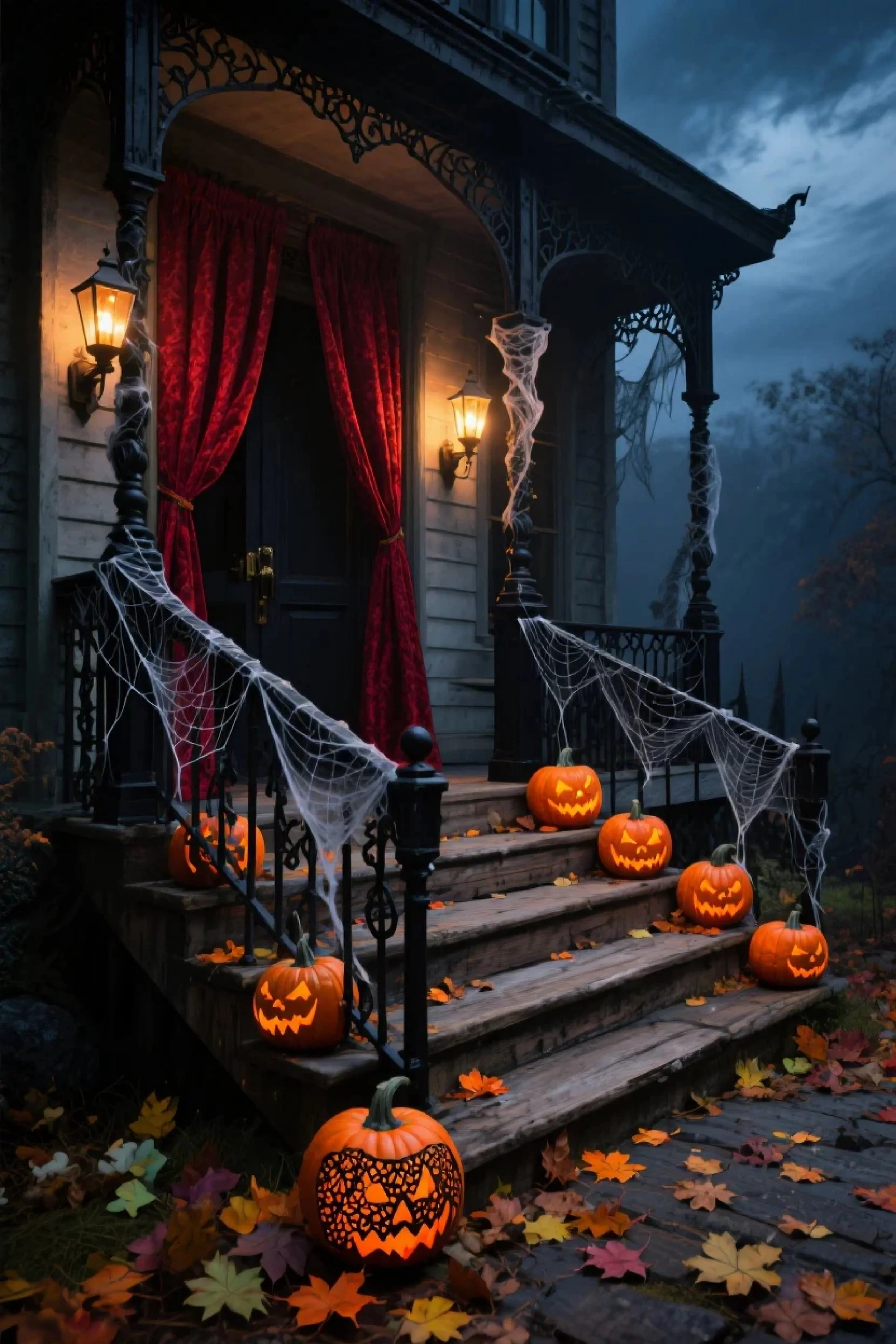 This moody, atmospheric porch embraces the darker, more theatrical side of Halloween. The aged wood steps and ornate wrought iron railings provide the perfect backdrop for a lineup of glowing jack-o’-lanterns, each carved with its own unique grin or sinister glare. Their warm, flickering light contrasts against the cool blue of the night, casting eerie shadows across the scattered autumn leaves below.