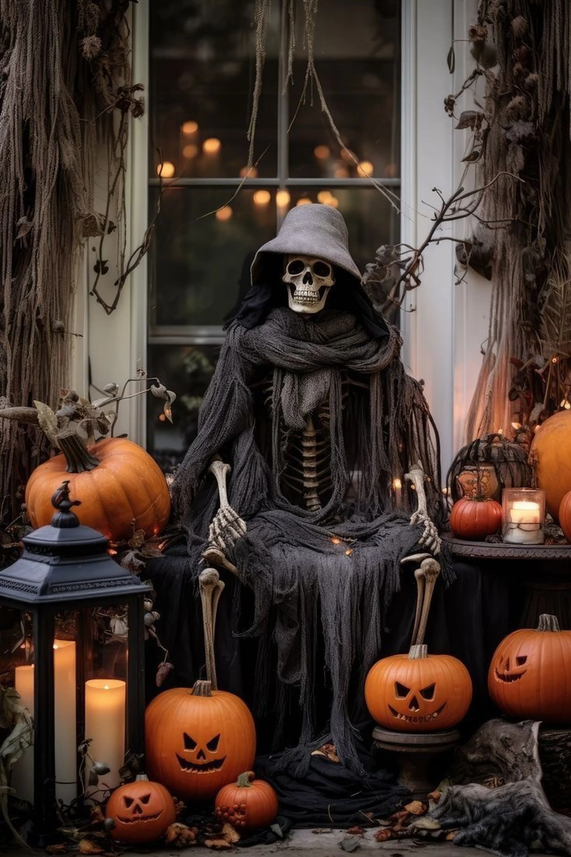 To recreate this eerie-yet-refined porch guardian, start with a poseable skeleton seated on a sturdy chair or bench. Layer it in loosely draped cheesecloth dyed gray or black, then add a wide-brim hat for a dramatic silhouette. Surround it with pumpkins in varied sizes and shades for visual depth—mix in a few faux carved jack-o’-lanterns with LED lighting for safety and longevity. Incorporate a black lantern filled with LED or flameless candles for that warm, haunting glow without the fire hazard. Finish with dried cornstalks, twigs, or grapevine garlands to frame the scene in rustic decay.