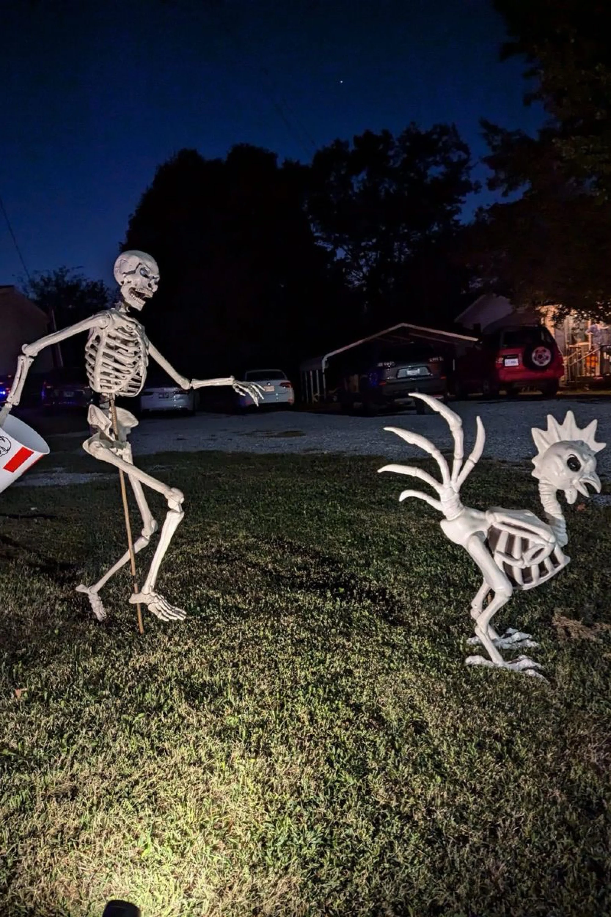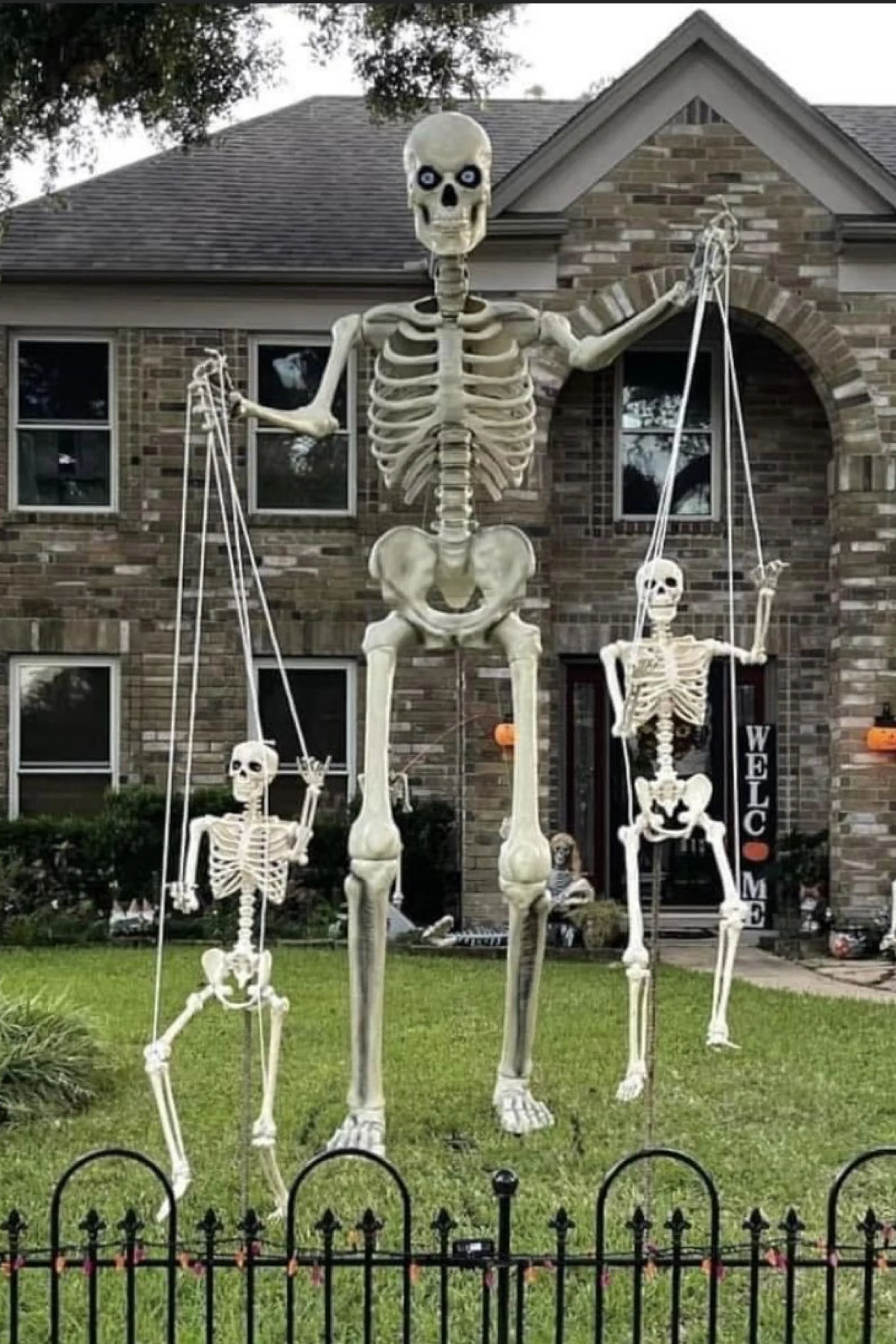 The backdrop of the home—with its brick exterior, subtle fall accents, and perfectly groomed lawn—provides the ideal stage for this skeletal performance. This display not only works as a Halloween decoration but also as a visual metaphor—suggesting unseen forces pulling our strings. Whether viewers read it as a playful joke or a chilling warning, it’s guaranteed to spark conversation.