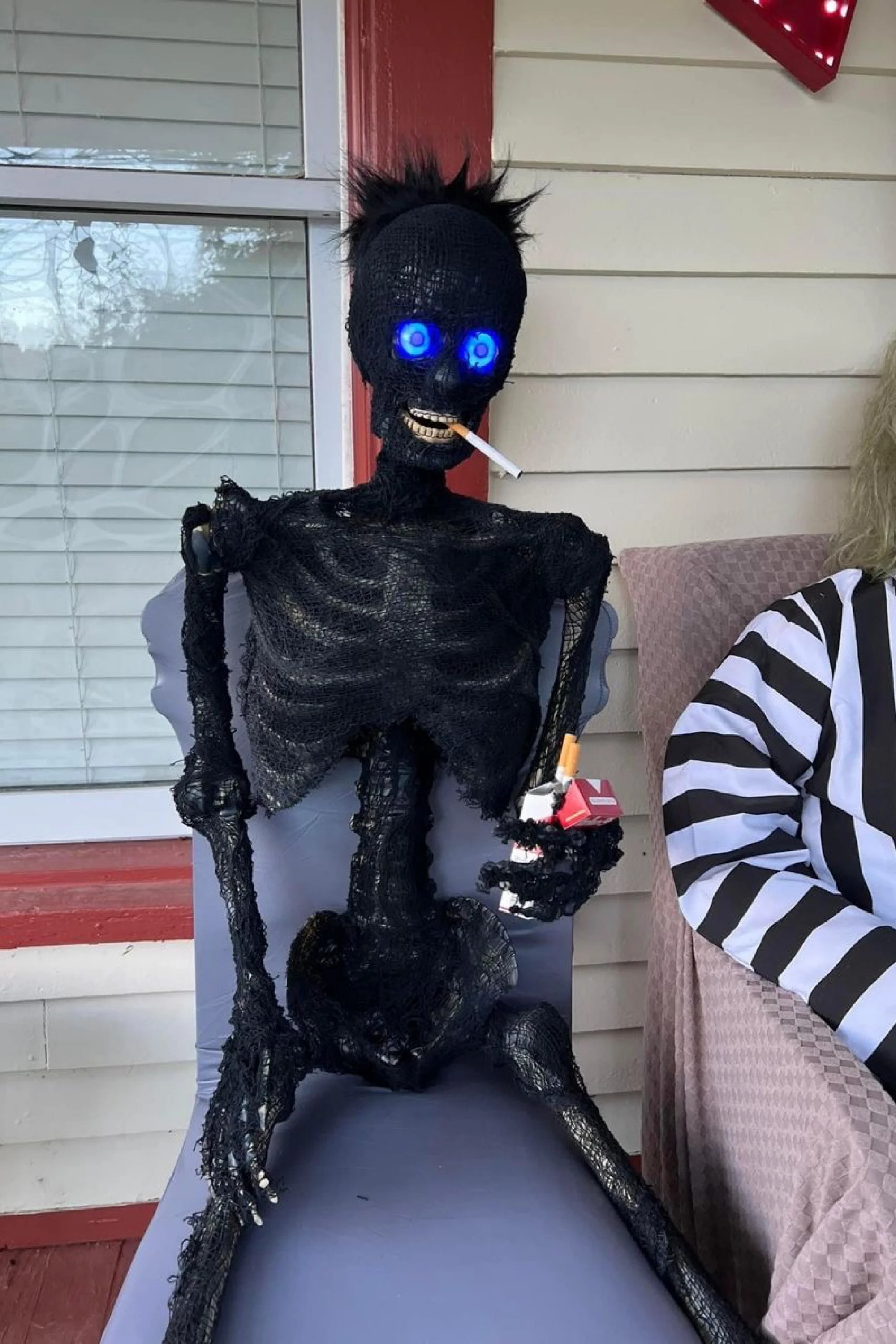 The skeleton’s pose says it all: slouched casually in a chair, one arm draped over the side, the other holding a pack of cigarettes with a fresh one clamped between its teeth. The cigarette props and nonchalant posture make it feel like this character has been sitting there for years—watching the neighborhood, judging the costumes, and offering unsolicited advice to trick-or-treaters.