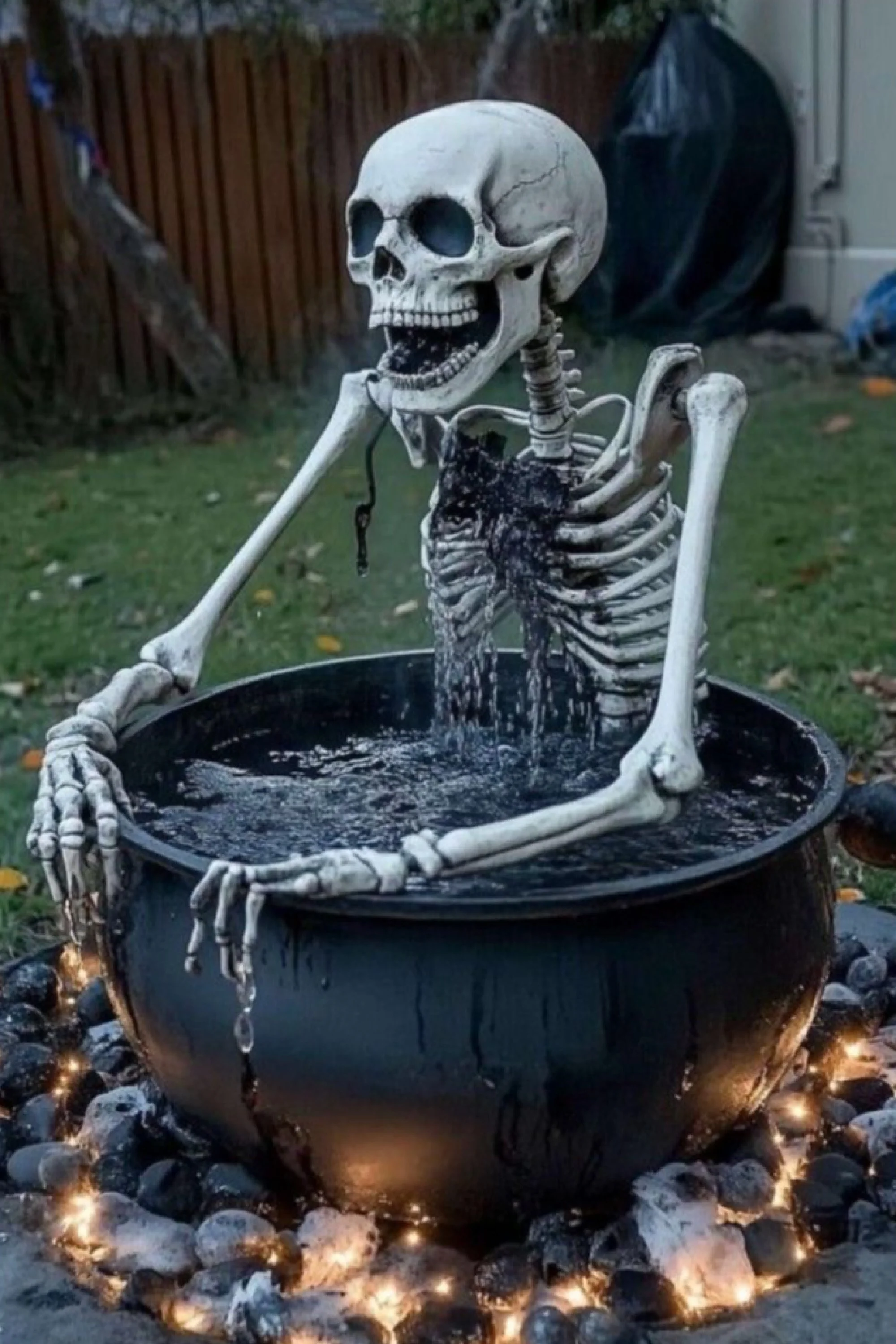 To heighten the effect, consider adding a fog machine so wisps of “steam” rise from the cauldron, or sound effects of bubbling and cackling witches to immerse visitors. If you want a more humorous spin, you can dress the skeleton in an apron or chef’s hat, giving it an absurd, self-aware personality.