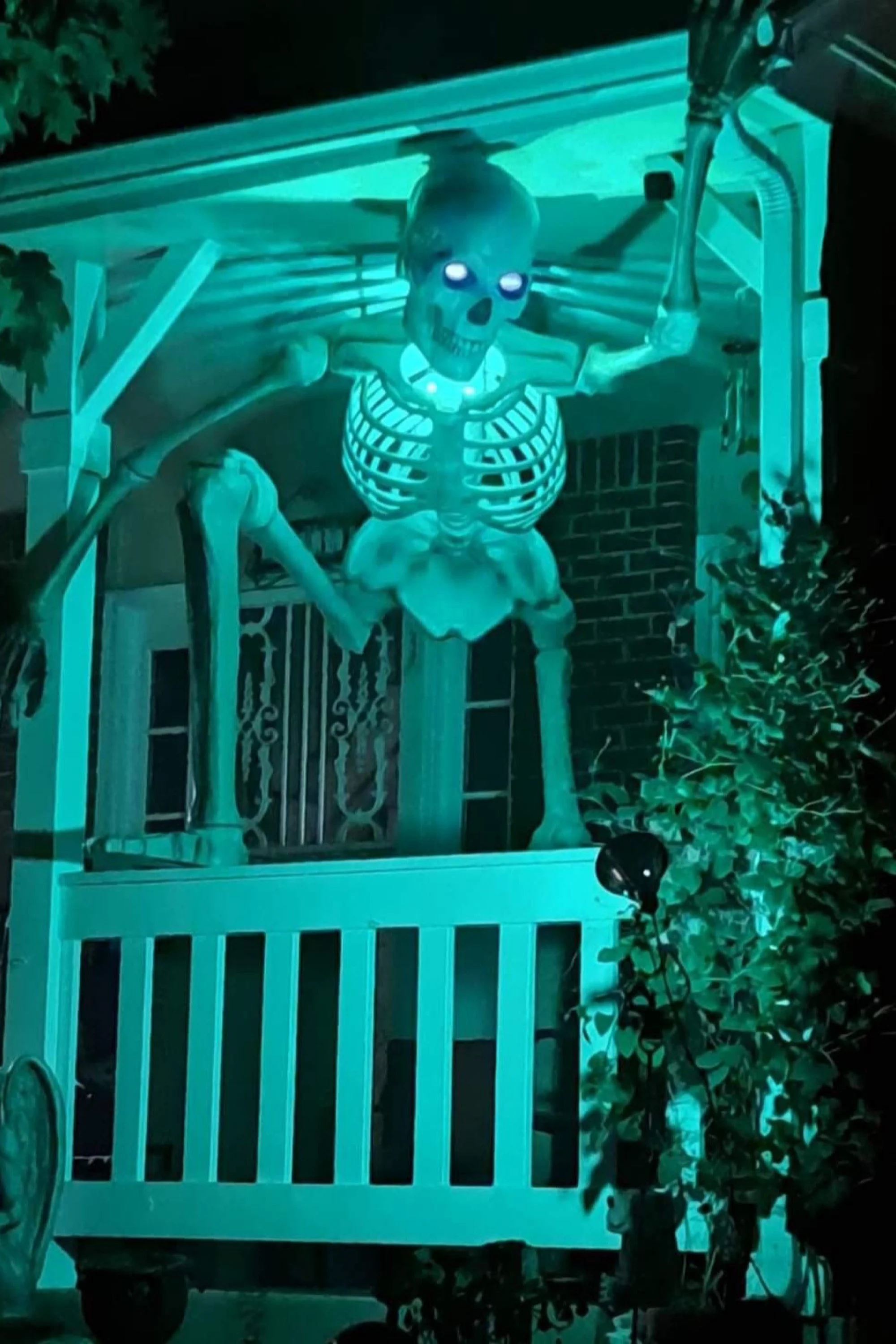 The blue LED eyes are the focal point, drawing immediate attention and giving the skeleton a supernatural aura. They’re especially effective at night, when the glow cuts through the dark and makes the figure look alert, even if the rest of its body is relaxed. The setting—perched next to another costumed figure (possibly Beetlejuice)—adds to the sense that this skeleton is part of a bigger, quirky porch crew.