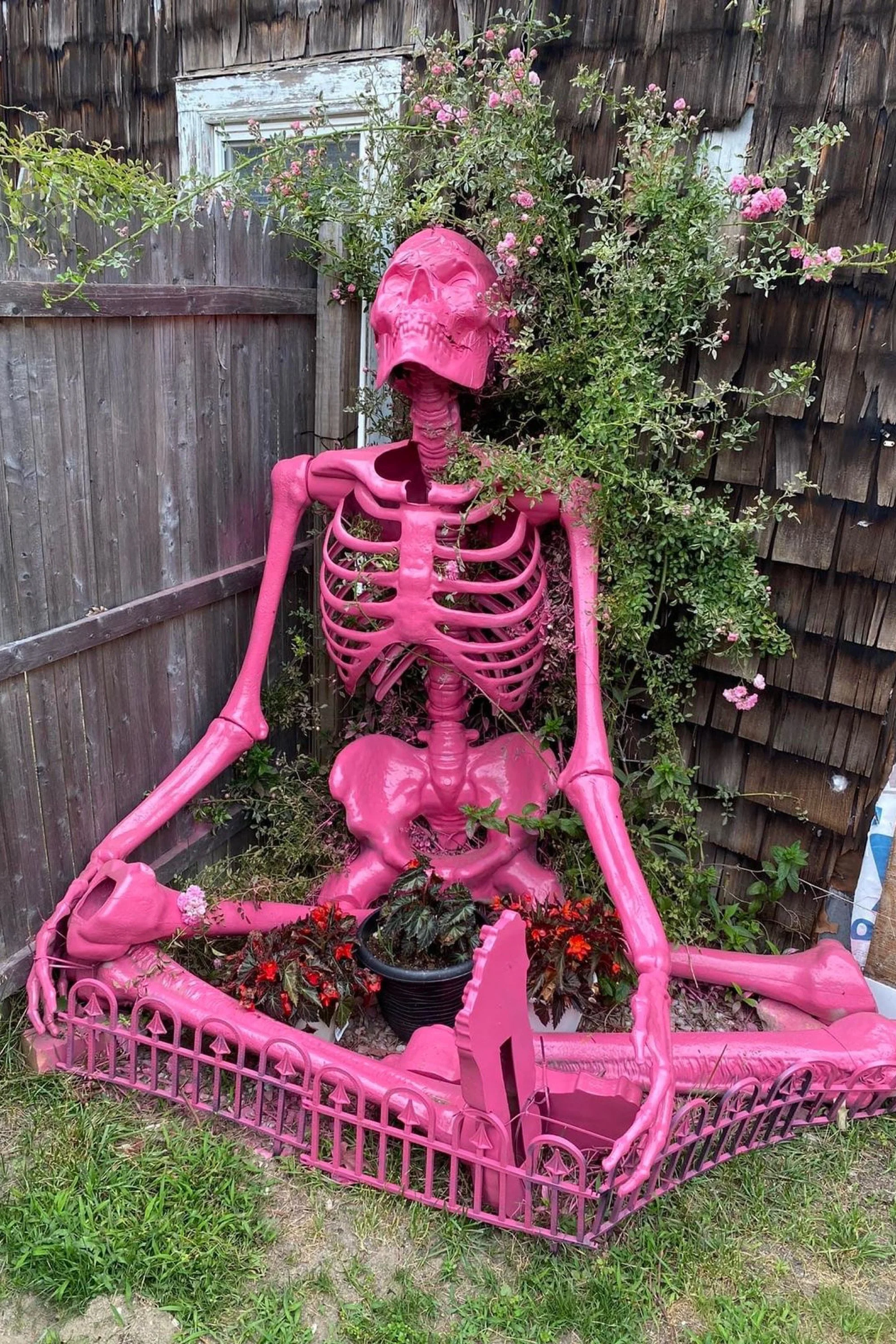 This show-stopping Halloween-meets-garden-art installation transforms the familiar skeleton prop into a vibrant, unexpected focal point. Painted in a striking bubblegum pink from head to toe, the oversized skeleton sits cross-legged in a meditative pose, enveloped by blooming greenery and pops of bright flowers. It’s an unusual fusion of spooky season and cheerful garden charm—proof that Halloween decor doesn’t have to stick to black, orange, and cobwebs to make an impact.