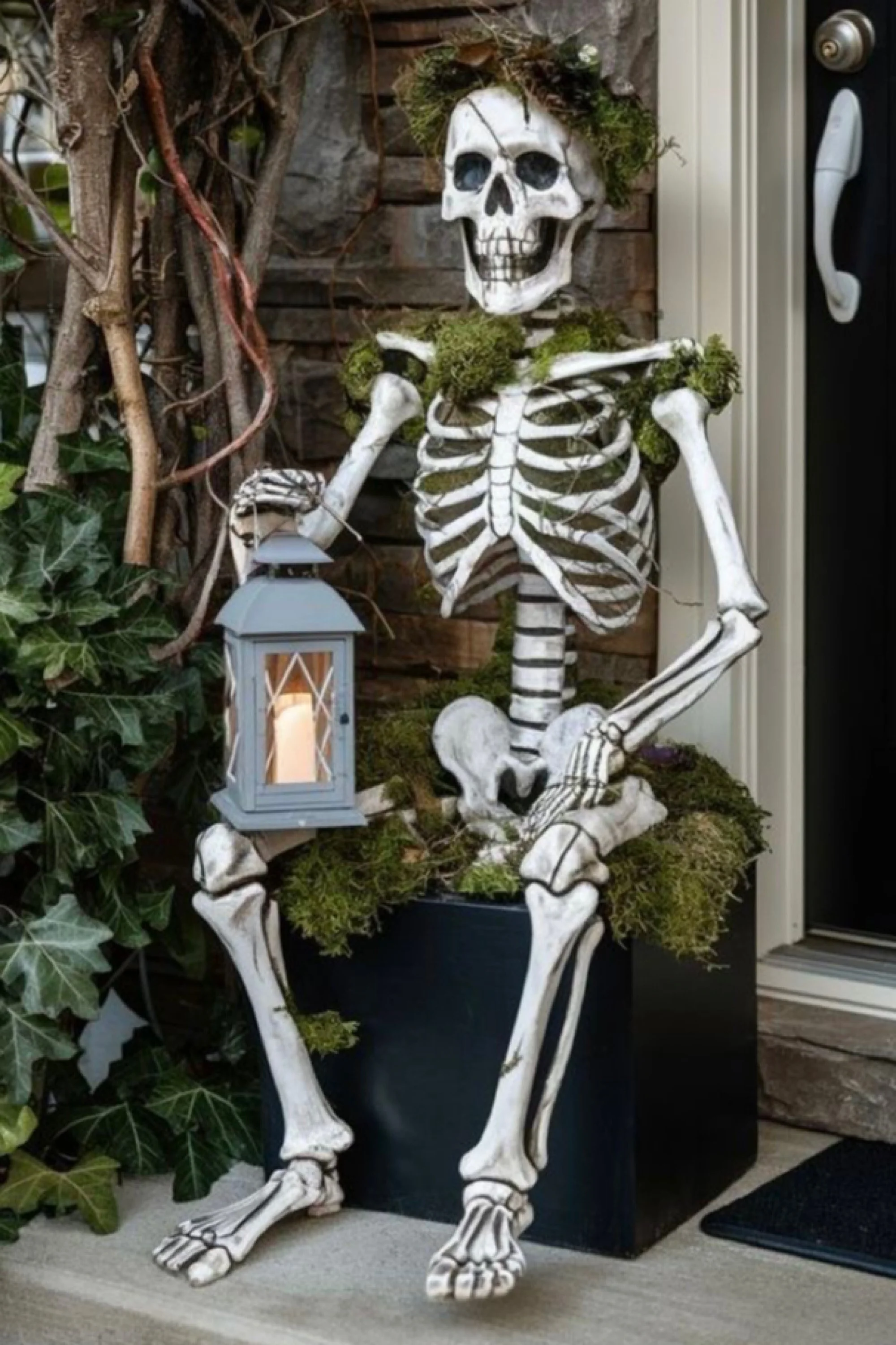 To recreate this whimsical yet haunting figure, start with a poseable skeleton seated in a tall planter box or sturdy outdoor seat. Adorn it with preserved moss, securing pieces with floral wire or hot glue for a natural fit around joints and along the skull. Place a lantern in one hand, preferably in a soft, muted tone like gray or powder blue, to keep the aesthetic grounded and earthy. Surround the display with potted ivy or faux climbing vines to build that immersive woodland feel. For an added touch, tuck a small faux bird or woodland creature into the moss for a “just discovered” effect.