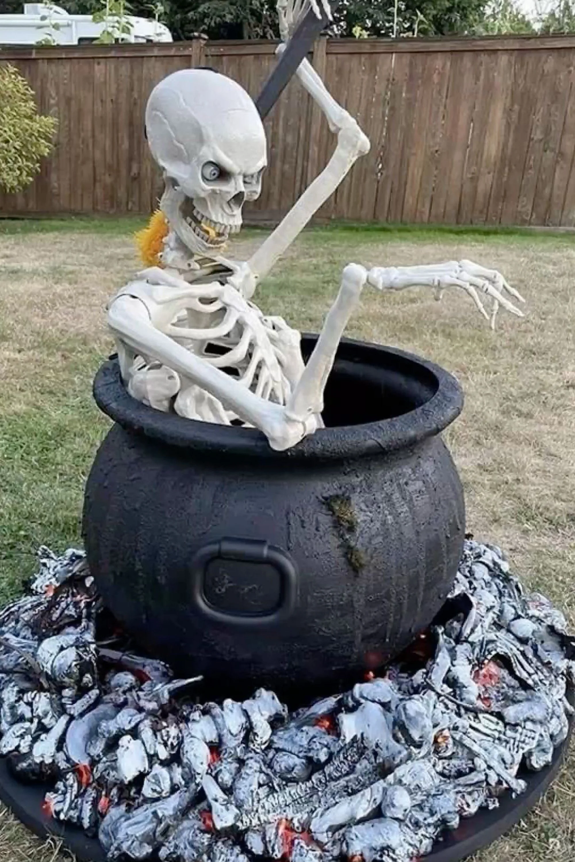 To recreate a similar scene, start with a life-size poseable skeleton and a large cauldron prop. Position the skeleton so that one arm rests on the rim for stability while the other holds a long prop spoon or paddle. Anchor the figure securely so it doesn’t tip over in wind.