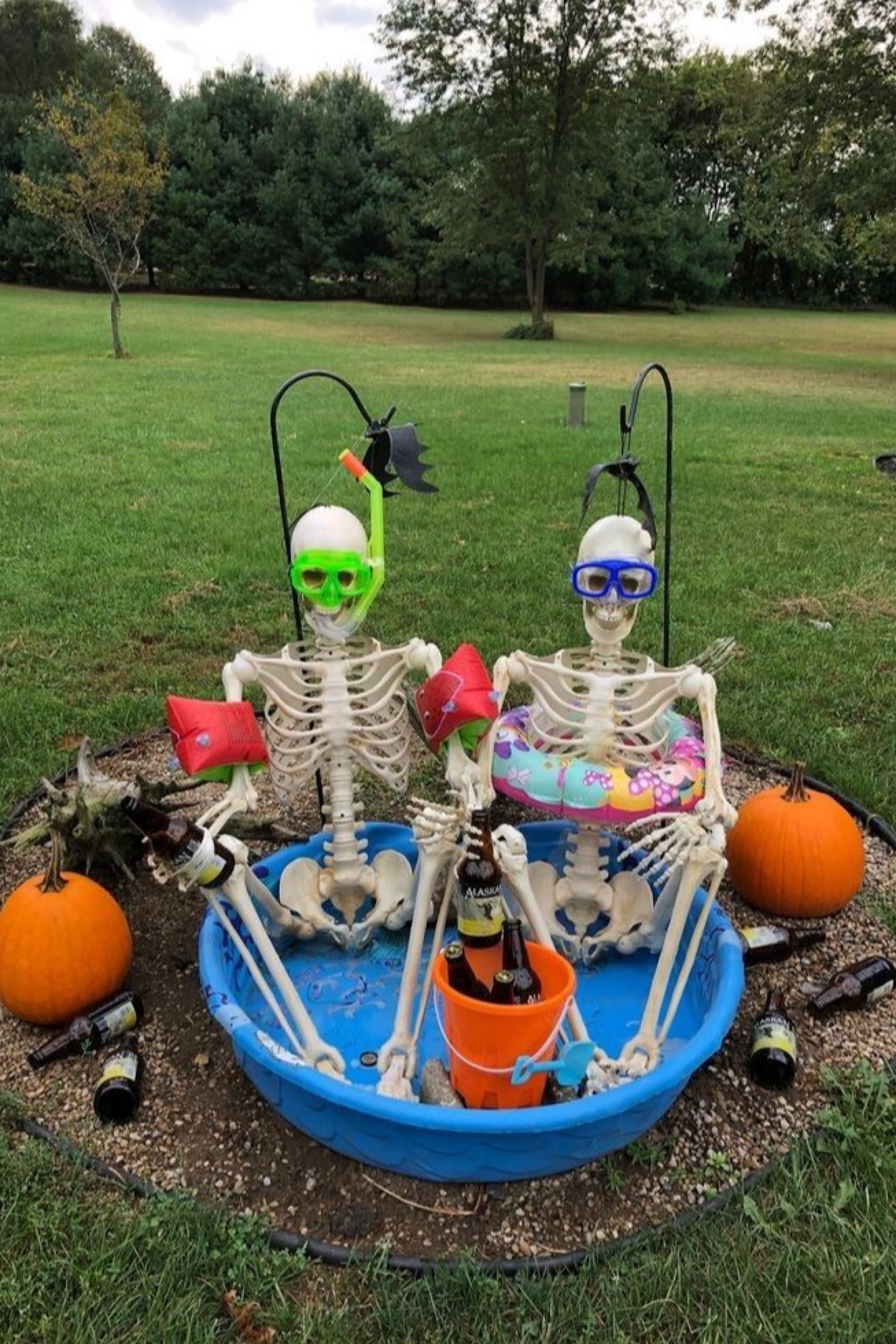 To create your own skeleton pool party, start with a kiddie pool in a bright, summery color. Arrange skeletons inside as if they’re in mid-relaxation—arms draped over the sides, legs stretched out, or hands holding props. Add fun summer accessories: goggles, snorkels, floaties, and beach balls work great. You can secure these items with zip ties to keep them in place outdoors.