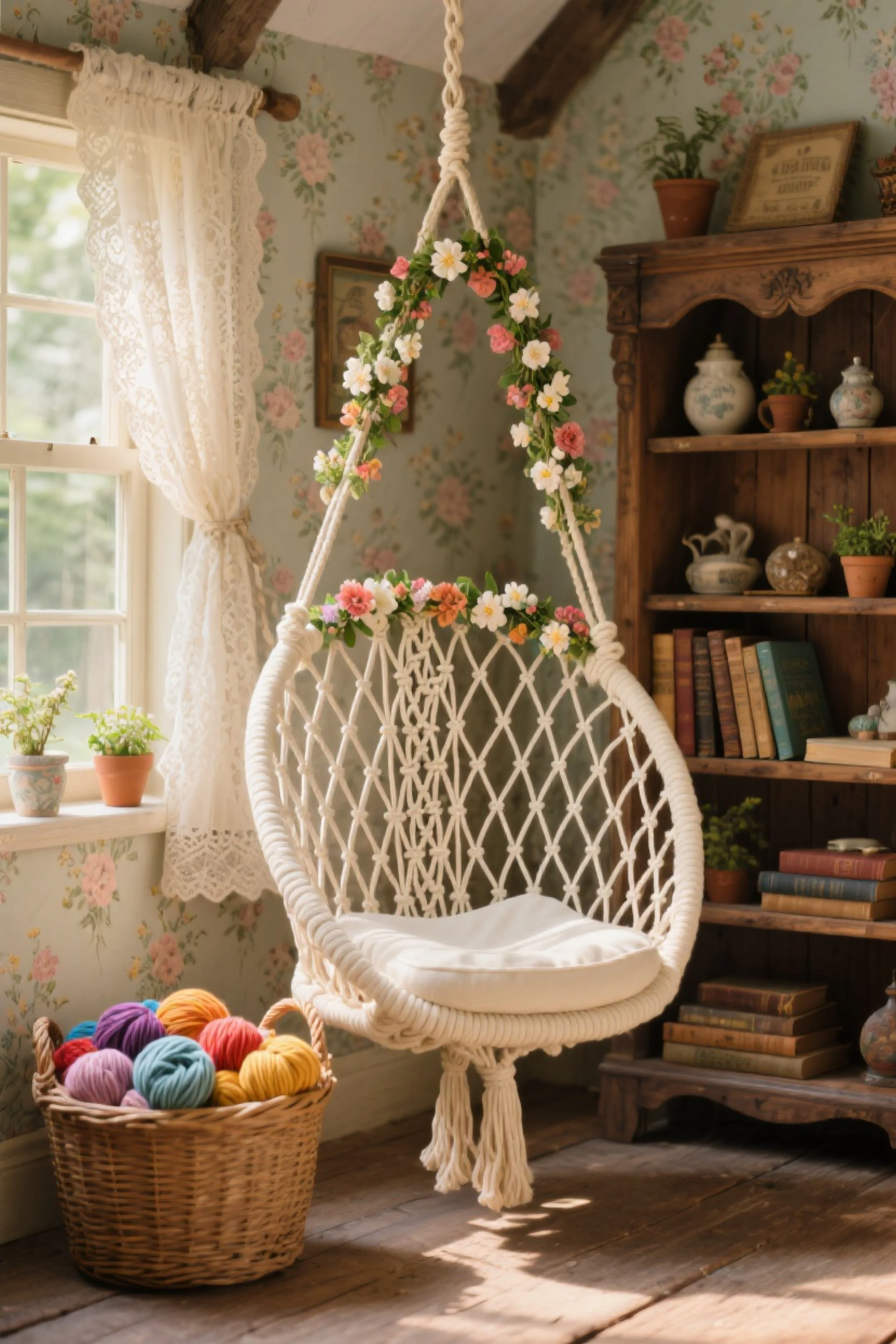 This floral-adorned macrame hanging chair feels like it belongs in a storybook cottage. Its intricate knotted design is enhanced by a garland of pastel blossoms woven around the ropes, bringing a touch of romance and whimsy. The chair floats gracefully in a sunlit room decorated with lace curtains, wooden shelves, and vintage floral wallpaper. Positioned near a window, it catches the natural light, making the floral accents glow. A basket of colorful yarn balls beside the chair adds to the homey, creative charm, making it the perfect seat for afternoon knitting, journaling, or simply daydreaming.