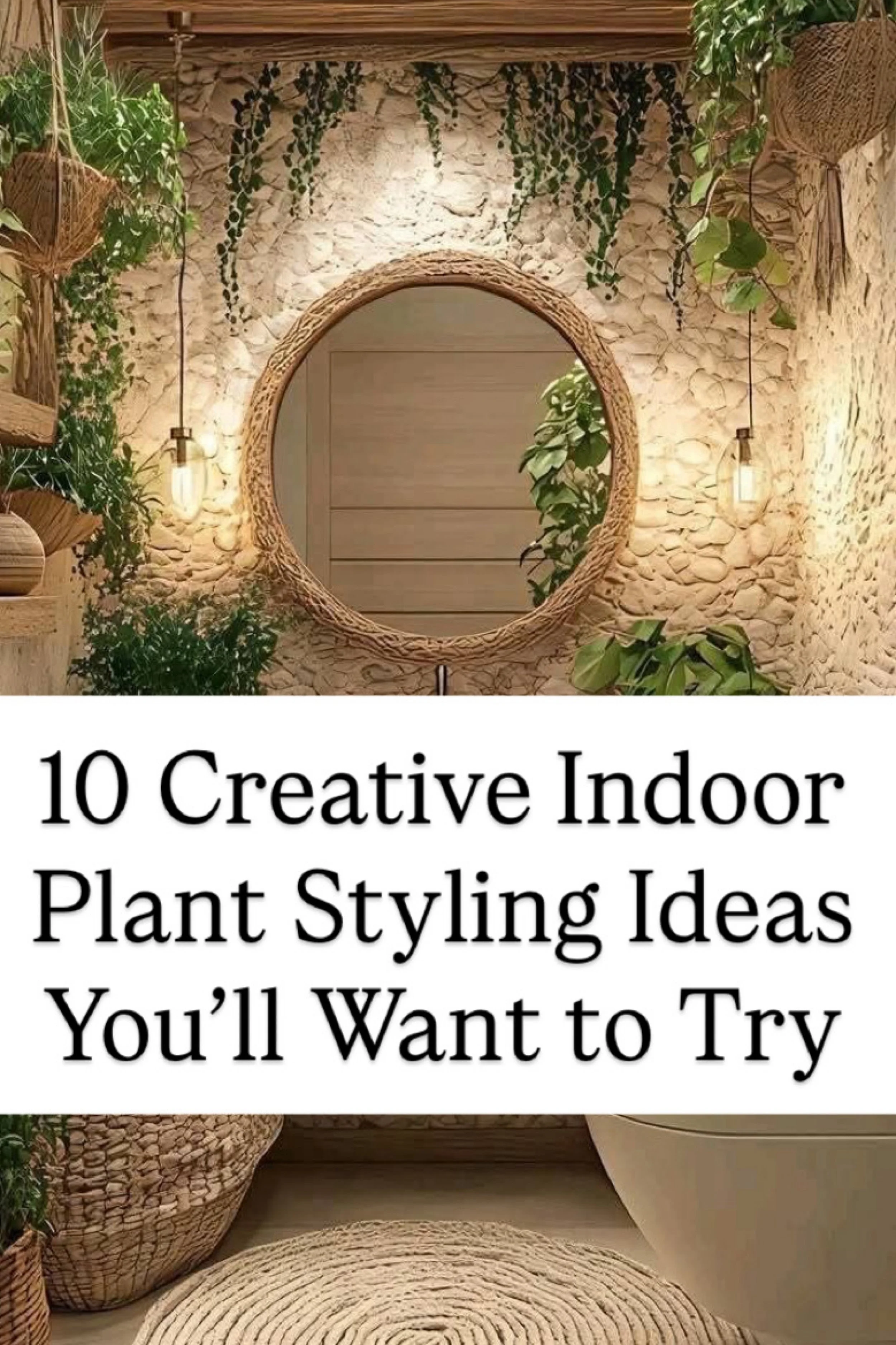 This bathroom brings the outdoors inside with a lush, spa-like setup. Woven baskets cradle green plants, while the stone-textured wall and circular mirror create a rustic yet refined backdrop. The greenery is layered thoughtfully, from cascading hanging plants overhead to tabletop varieties flanking the sink. Warm pendant lights soften the atmosphere, casting golden tones across the textured surfaces. The combination of natural materials—wood, rope, stone, and greenery—feels both grounding and luxurious. This is not just a bathroom; it’s a botanical retreat that soothes the senses and elevates everyday routines into rituals of relaxation.