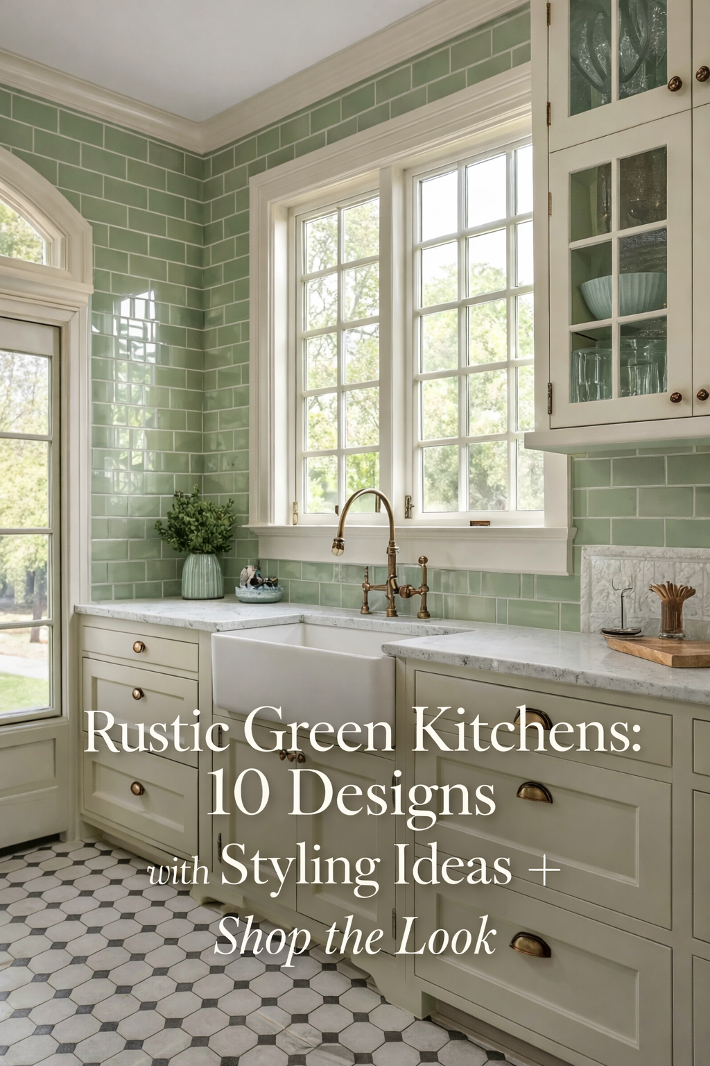 This kitchen design highlights the timeless appeal of sage green through glossy subway tile walls that create a refreshing yet elegant backdrop. Ivory cabinetry with brass cup pulls adds contrast and sophistication, while a large apron-front farmhouse sink sits gracefully beneath tall windows. The marble countertops contribute a refined texture, reflecting the natural light that floods the space. A patterned hexagonal floor ties the whole palette together with visual depth. The glass-front cabinets showcase delicate dishware and add a subtle charm to the space. This kitchen balances traditional details with modern livability, creating a versatile environment where style and function coexist beautifully.
