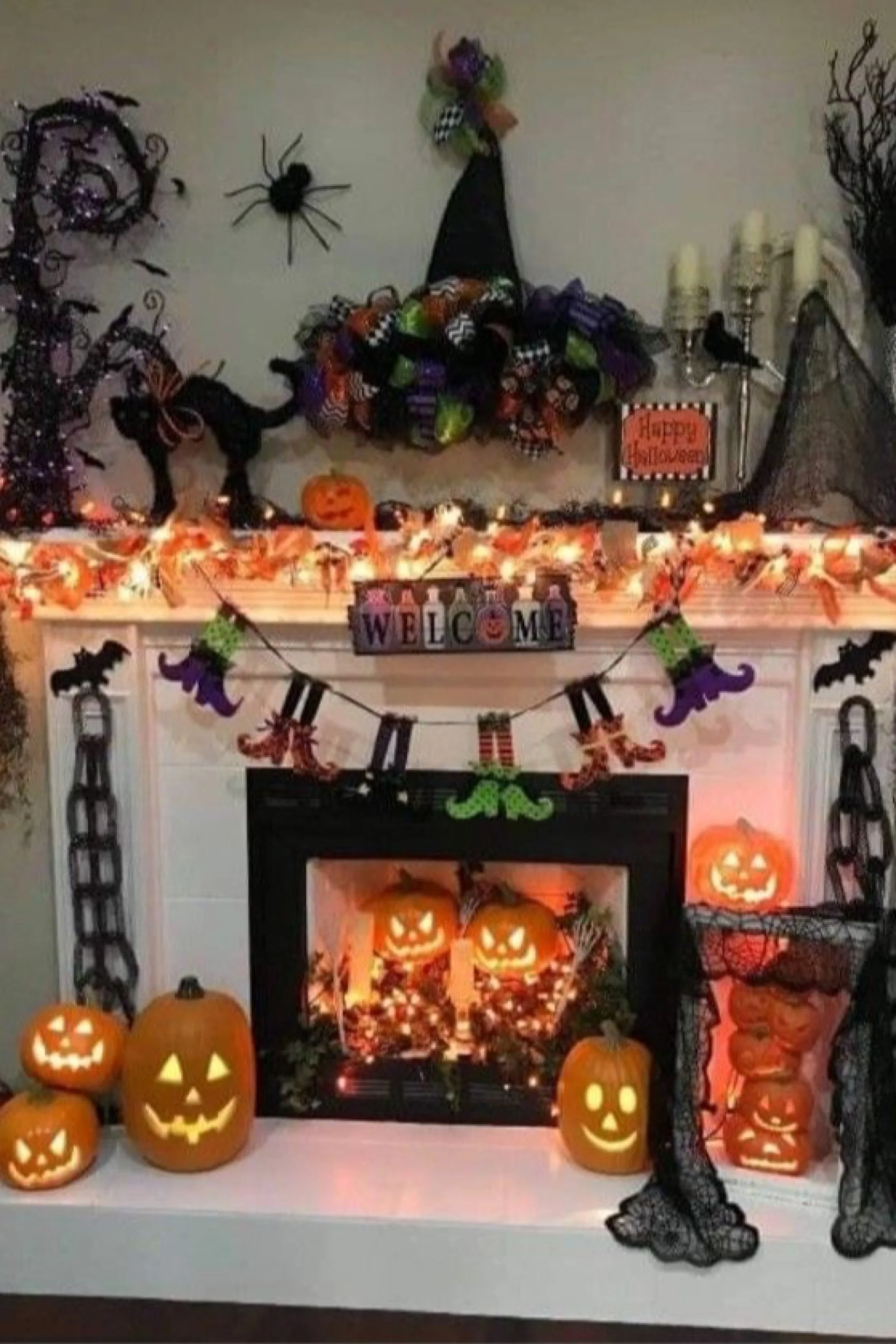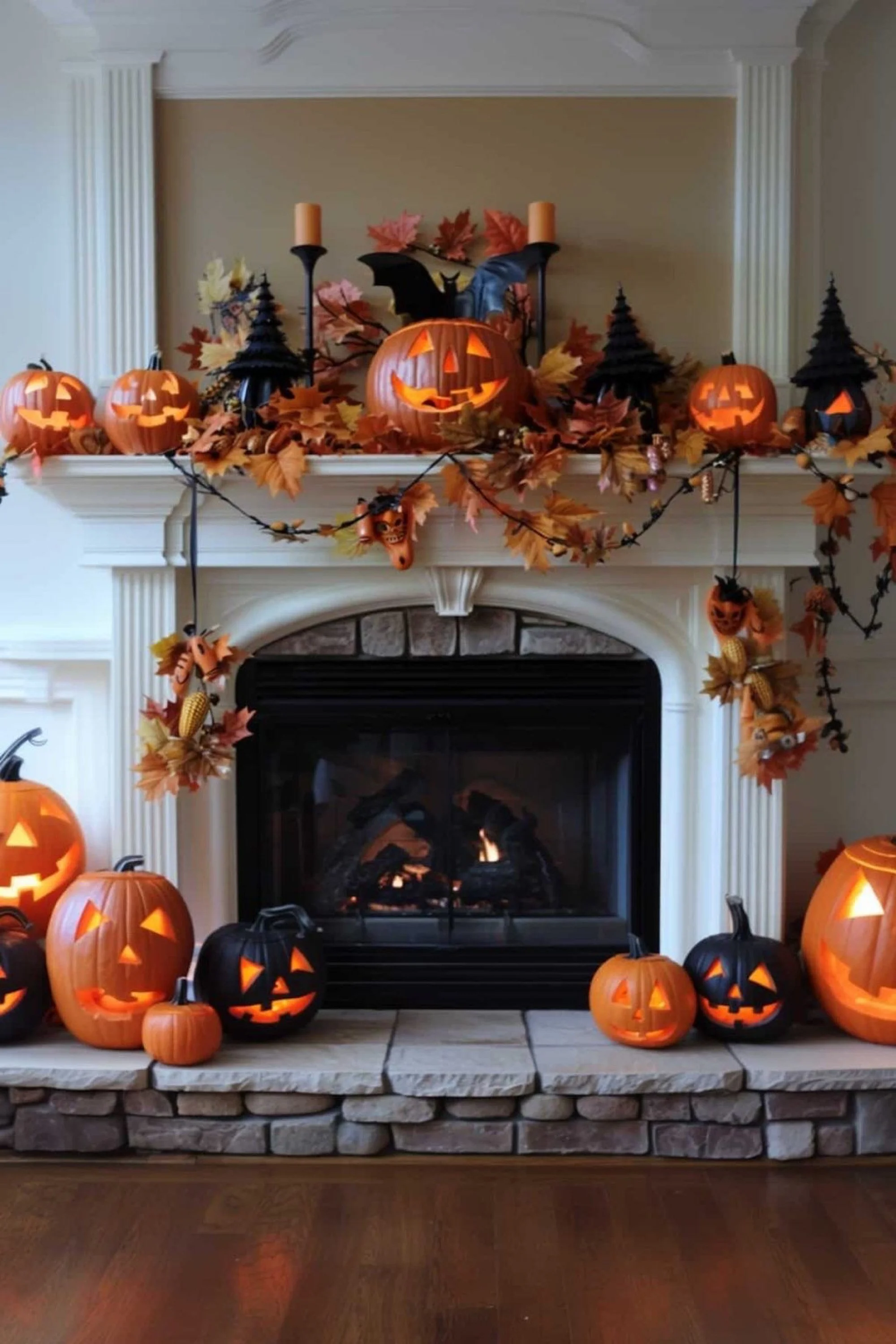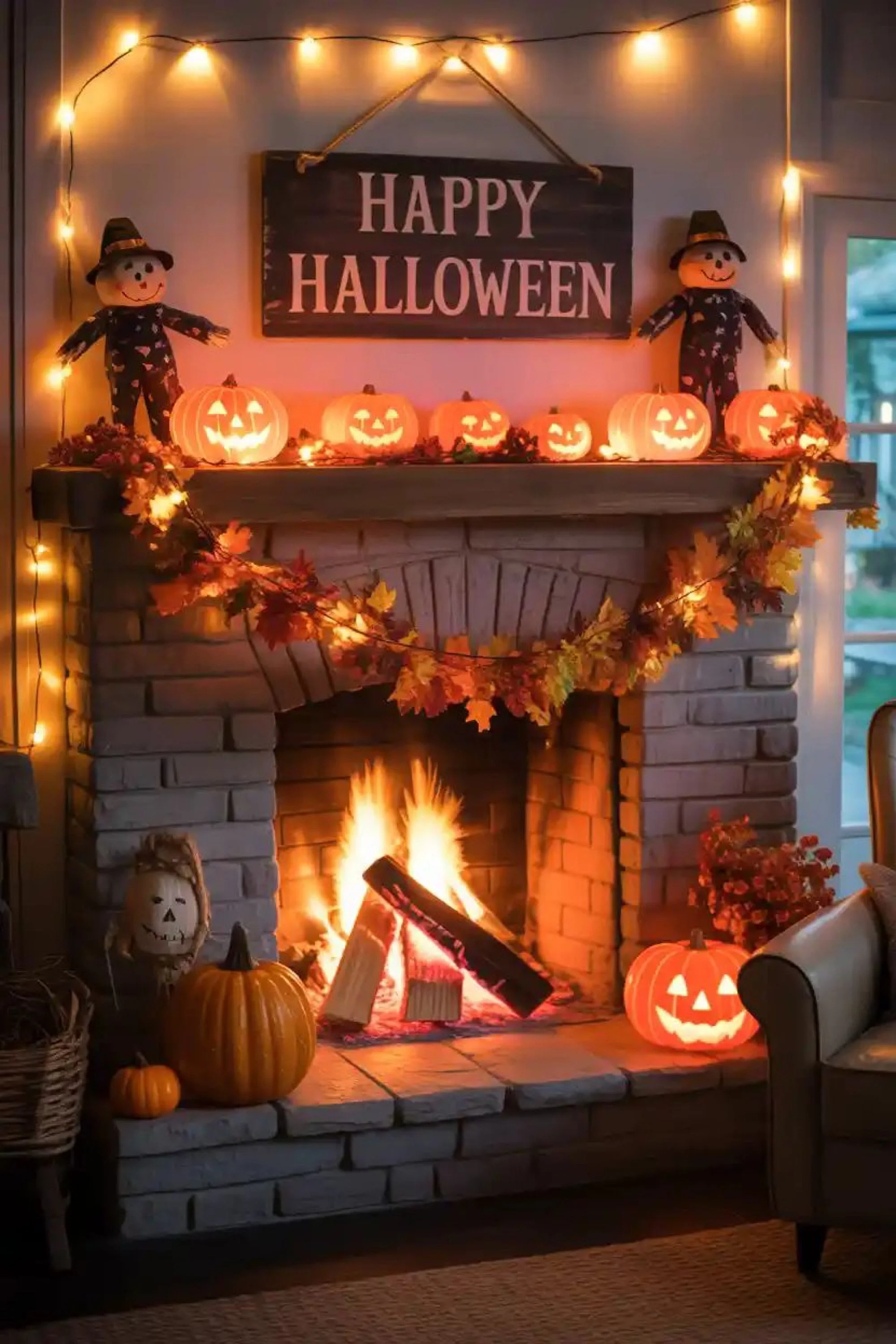 Begin with a central wooden or rustic-style sign. Frame it with warm fairy lights and a leafy garland. Layer in jack-o’-lanterns and candleholders for height, and add a string of mini pumpkin lights across the mantel. Use oversized pumpkins on the hearth for balance, and consider adding whimsical touches like a broomstick for character.