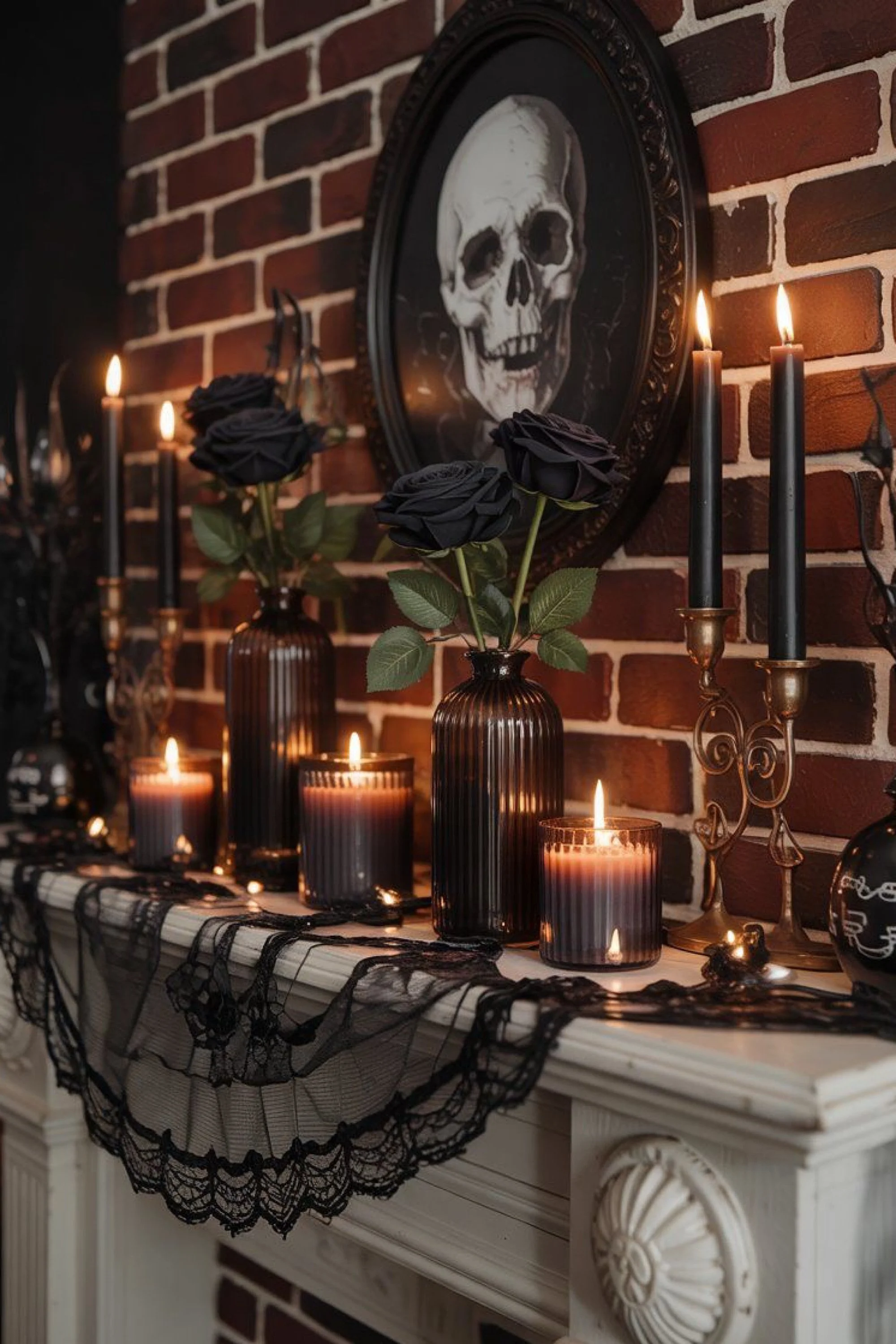To recreate this look, start with a dramatic backdrop—either a large framed mirror or an ornate piece of wall art. Keep your palette tight, focusing on black, deep red, and metallic accents. Use varied candle heights to create visual rhythm, and add organic touches like roses for romance. Incorporate aged items—vintage books, tarnished silver—for authenticity. The result will be a mantel that feels like it belongs in a haunted manor.