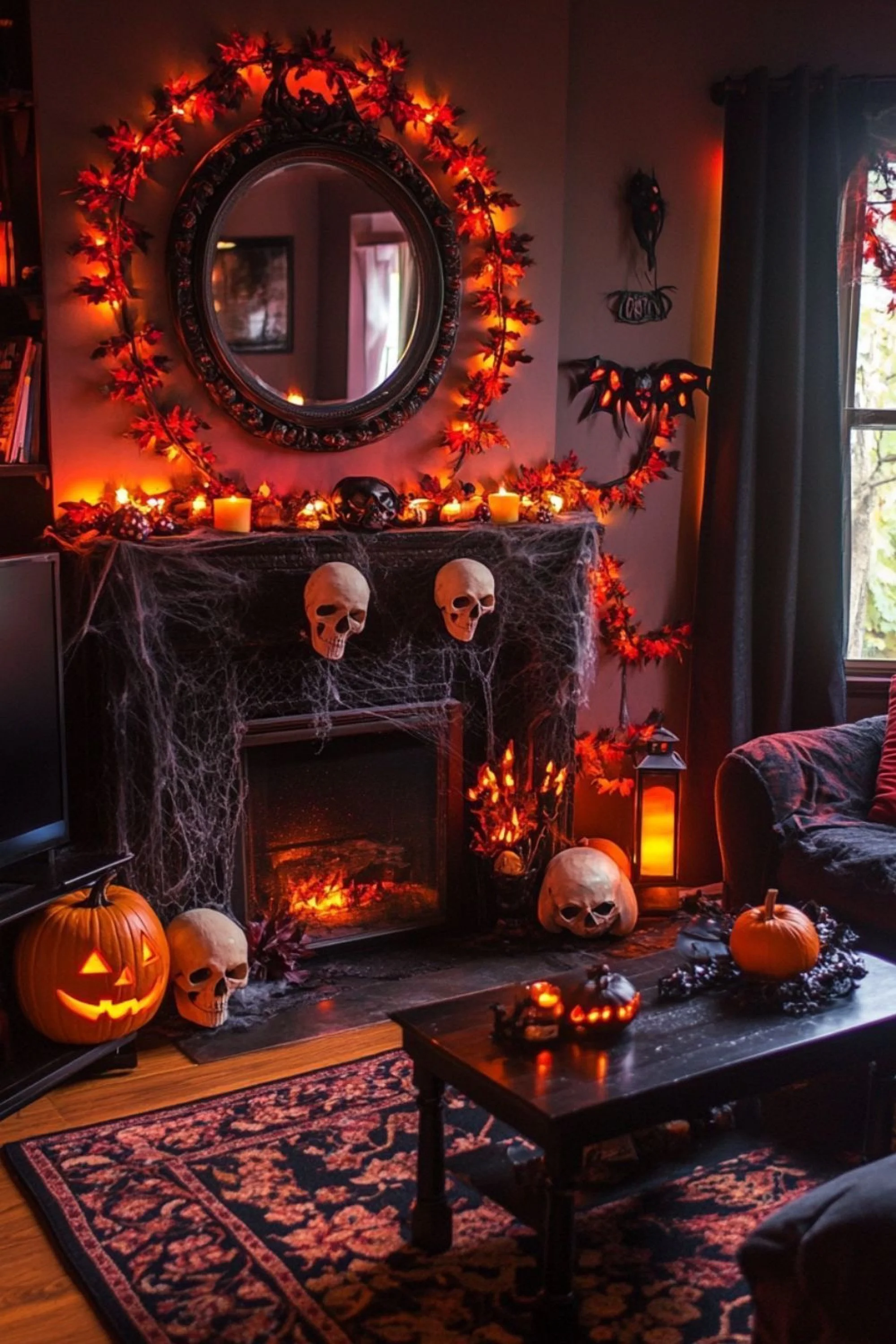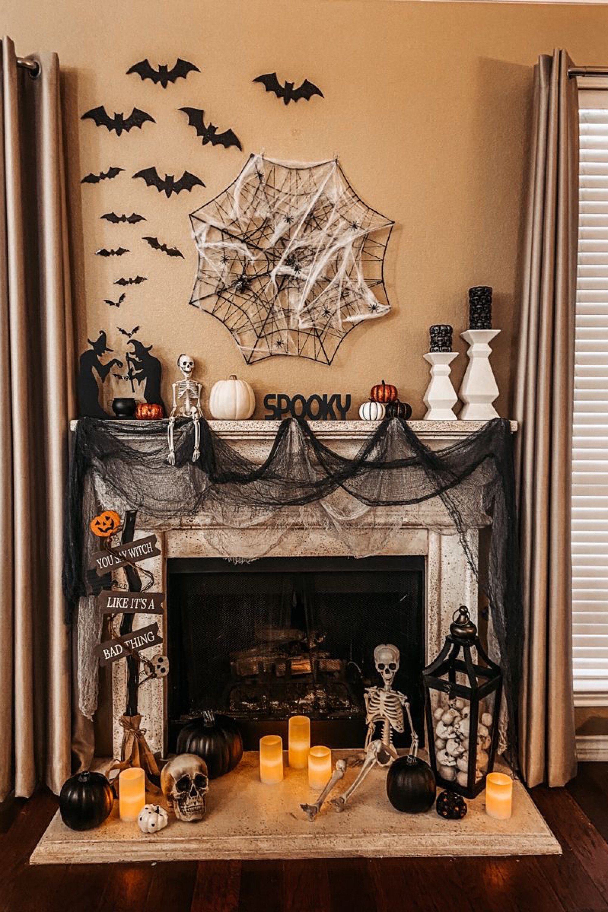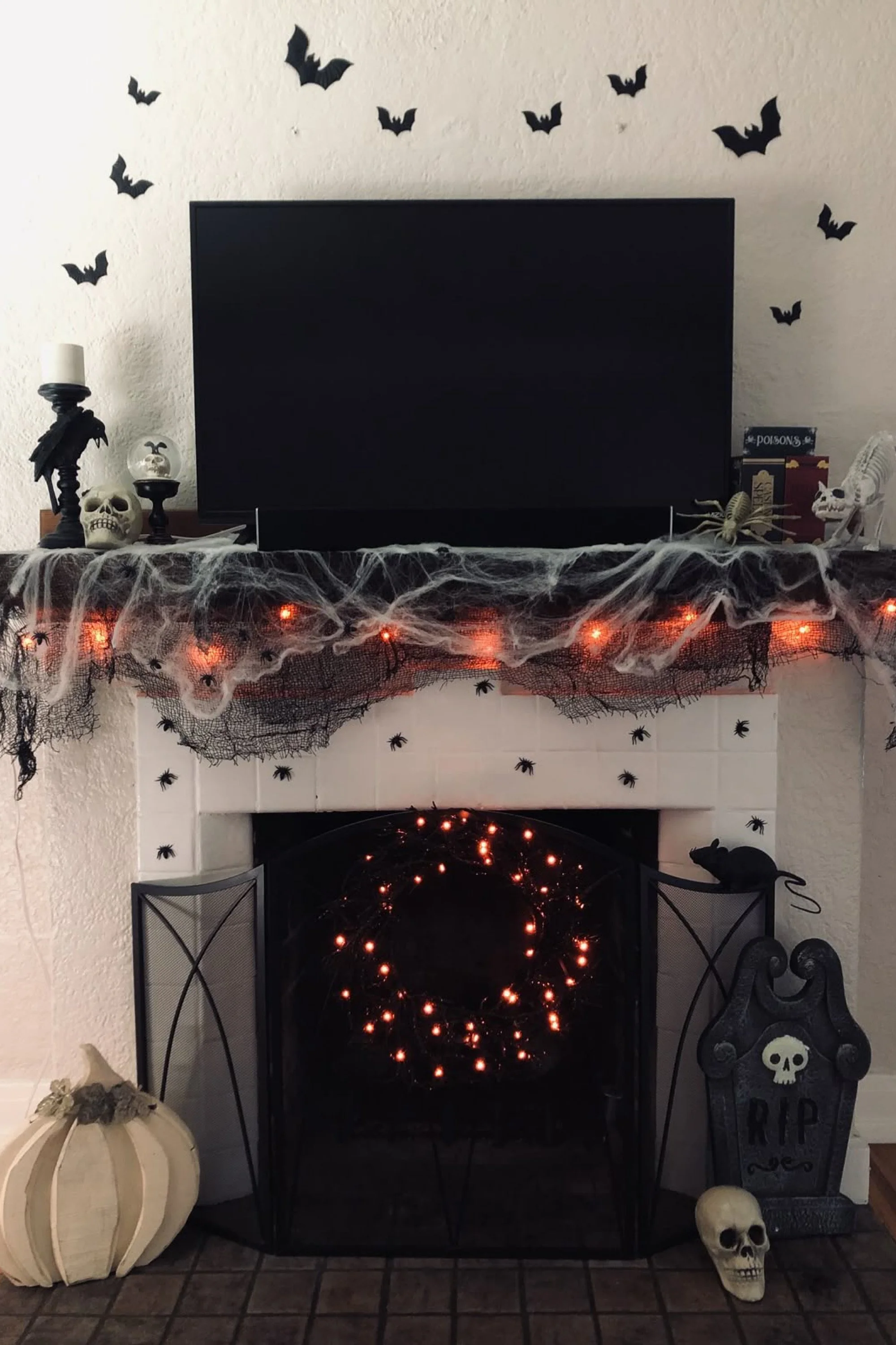 Drape black gauze over your mantel as a base layer, then layer white spiderwebbing on top. Secure small faux spiders throughout for detail. Arrange a few thematic props like skulls, potion bottles, and tombstones for personality. Add a warm glow with orange string lights, and extend your design to the hearth for balance.