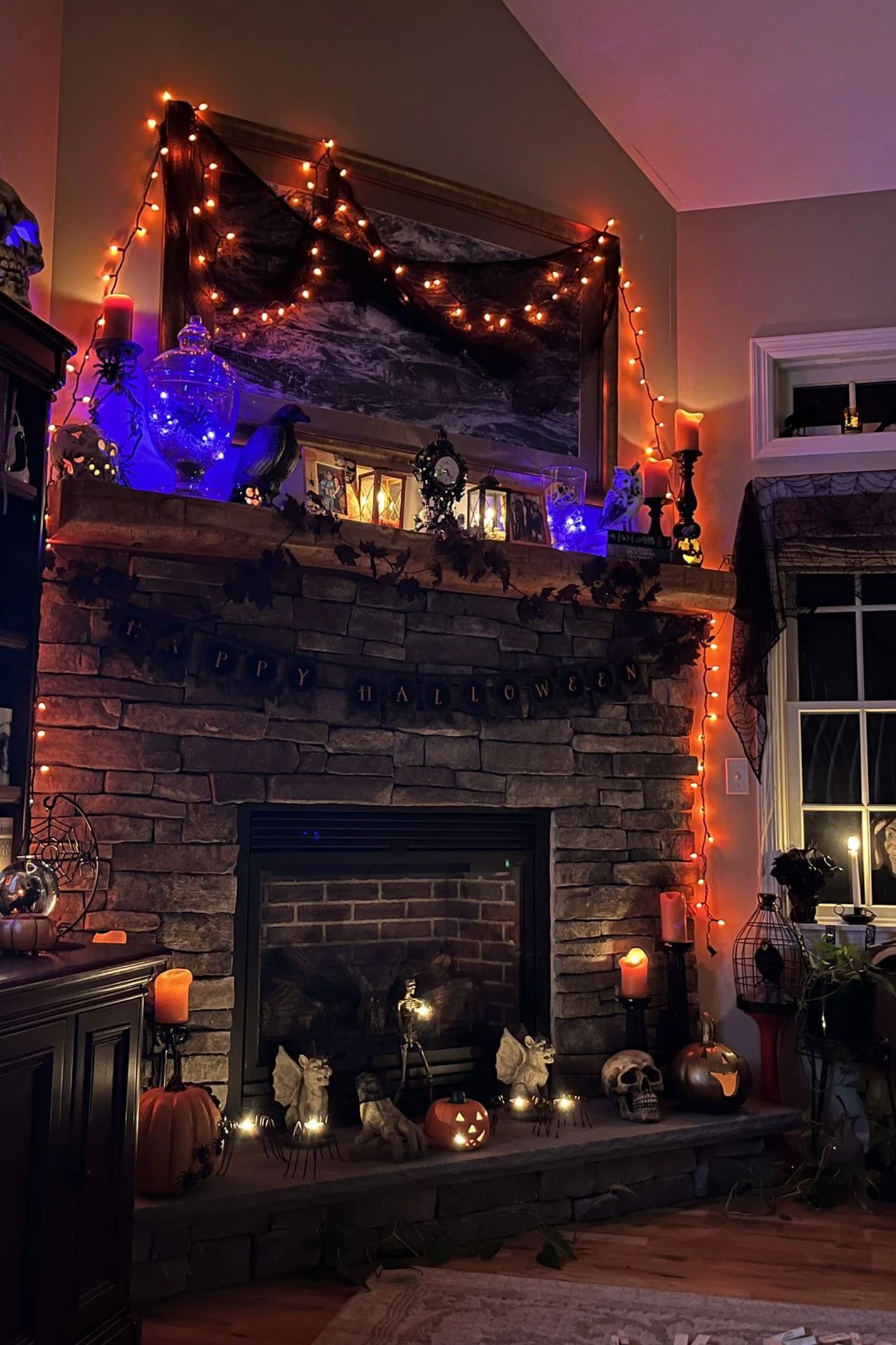 The mantel surface is styled with an array of mini tombstones, skulls, and potion bottles, while the fireplace glows with amber string lights for warmth. A giant spider crawls across the hearth, ensuring the creepy factor is in full swing.
