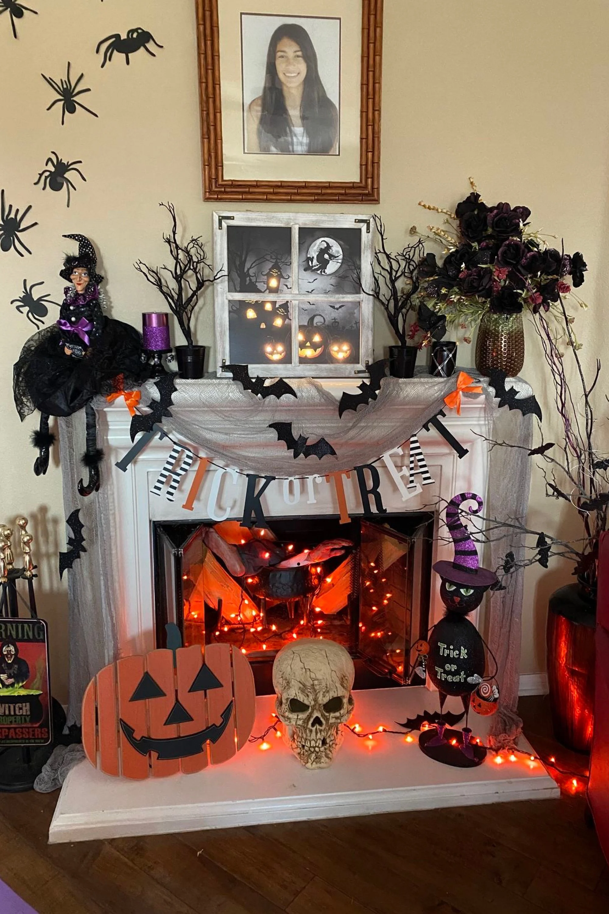On one side, a mischievous witch doll perches on the mantel’s edge, legs dangling playfully. On the other, a lush arrangement of black and burgundy roses in a textured vase adds moody drama. Bare black tree branches, both real and faux, rise up from vases to add height and an organic touch, while purple candles bring in a pop of color. The hearth carries the theme with a giant wooden pumpkin cutout, a realistic skull, and a black cat figurine in a purple witch hat holding candy buckets. Orange string lights weave through the lower area, casting a festive glow.