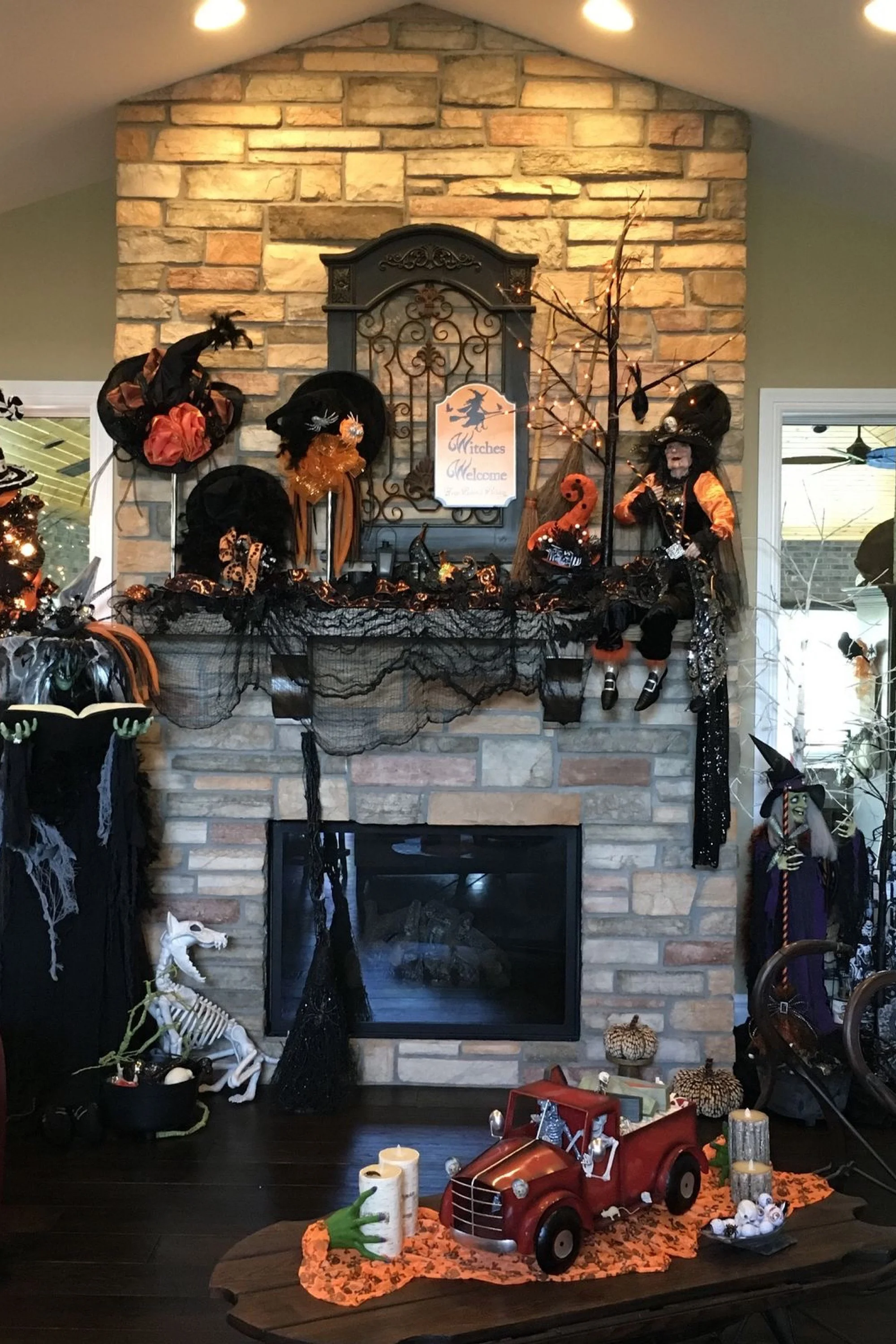 Start with a themed sign and position it at the center. Add tall decorative pieces like witch dolls and hats for height and variety. Use gauzy black fabric to create a cohesive base, layering smaller accents like pumpkins, cauldrons, and broomsticks. Extend your display to the hearth with playful props to make the whole room feel like part of the scene.