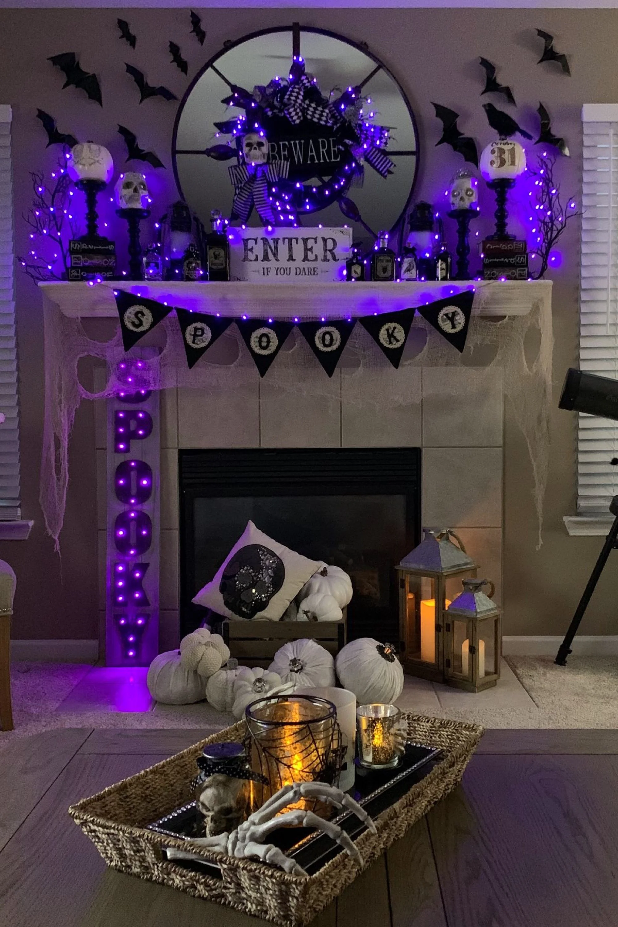 Across the mantel runs a gauzy layer of distressed cheesecloth, perfect for adding ghostly texture and depth. In front, a black bunting spelling out “SPOOKY” adds a playful note to the otherwise ominous styling. Below the mantel, a vertical “SPOOKY” marquee sign glows in purple, tying the light scheme together while drawing the eye downward. White pumpkins in varying sizes spill out of a rustic crate beside a sequined skull pillow, while two wooden lanterns filled with warm flameless candles provide a comforting amber contrast to the cooler purple lights.
