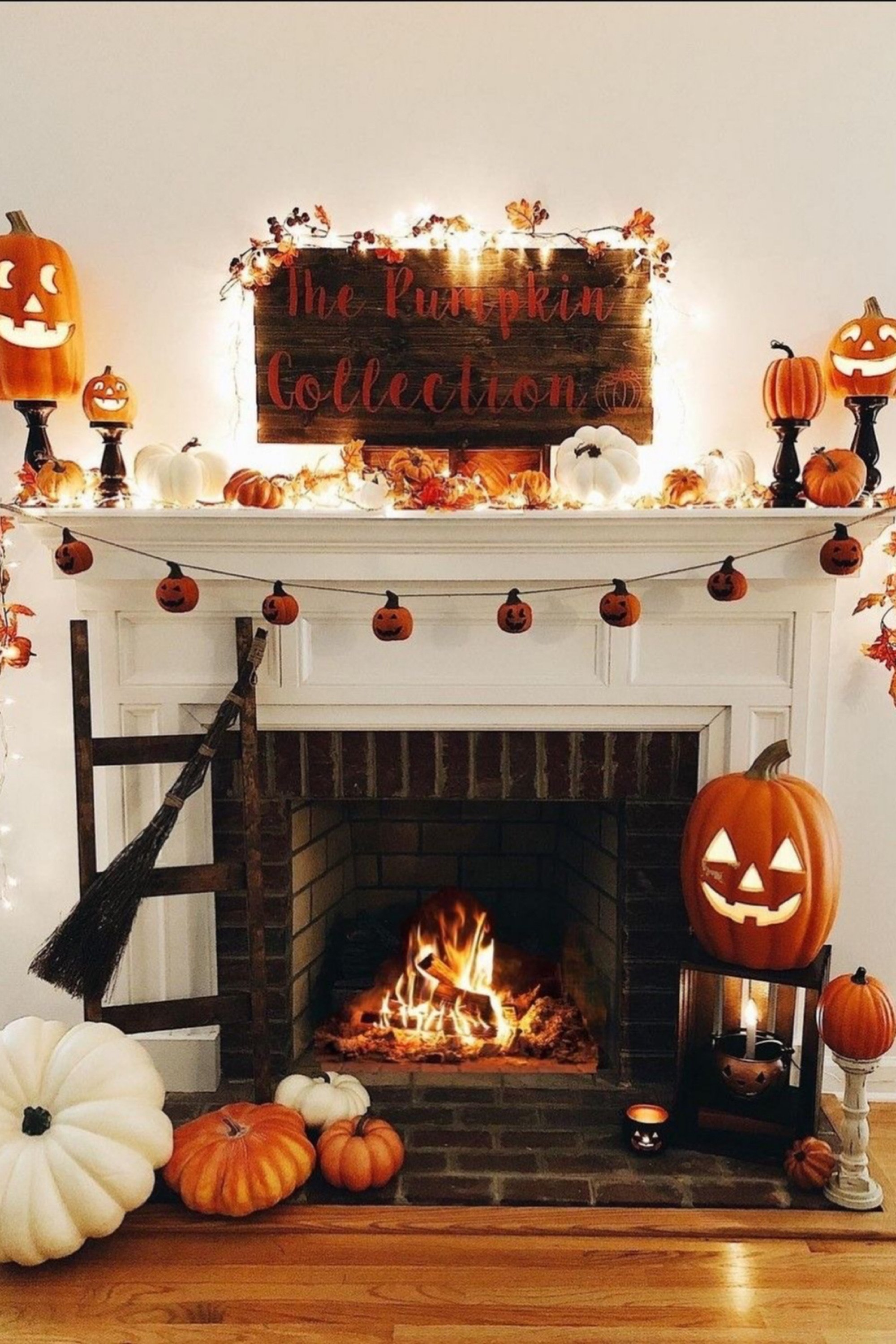 The hearth extends the theme with a large white pumpkin paired with smaller orange ones, a jack-o’-lantern lantern, and a white pedestal holding a mini pumpkin. A broom leans casually against the fireplace for a nod to Halloween witchcraft, while the flicker of the fire below adds to the cozy harvest vibe.