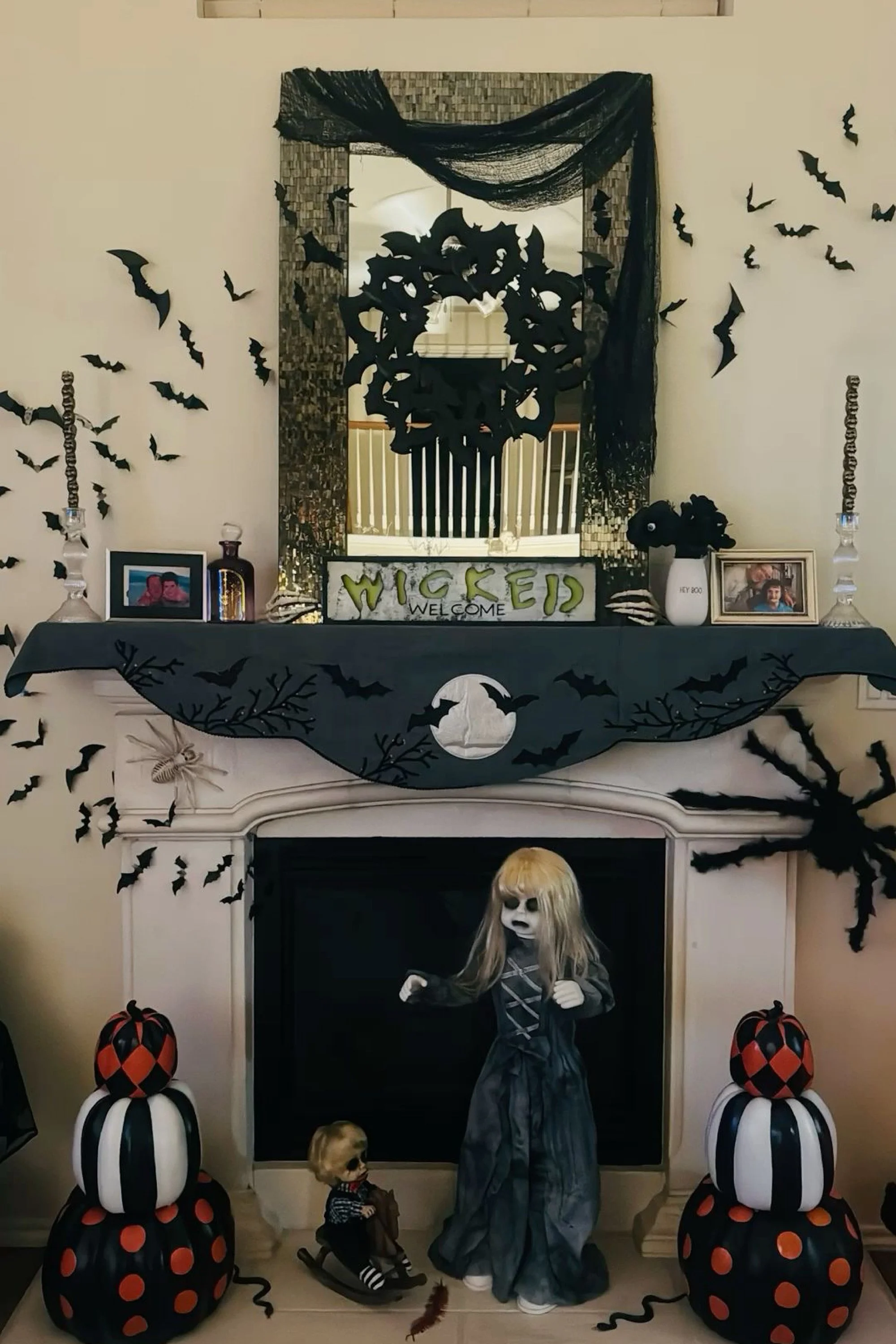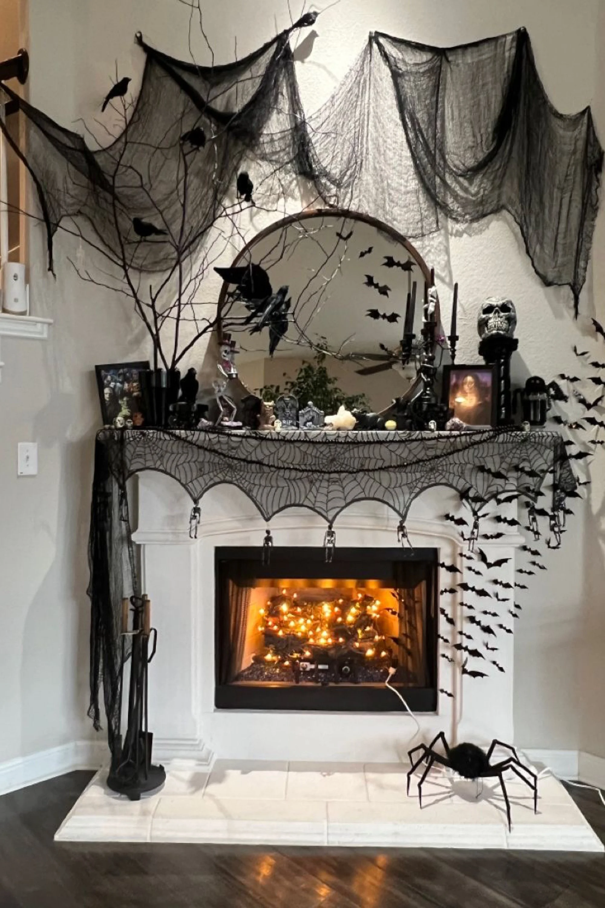 Use black gauze or webbed fabric to frame your mantel and wall. Add a mirror or art piece at the center and surround it with bat decals for motion. Fill the mantel with themed props like skulls, tombstones, and potion bottles. Add height with branches and crow figurines, and light the hearth with amber string lights.