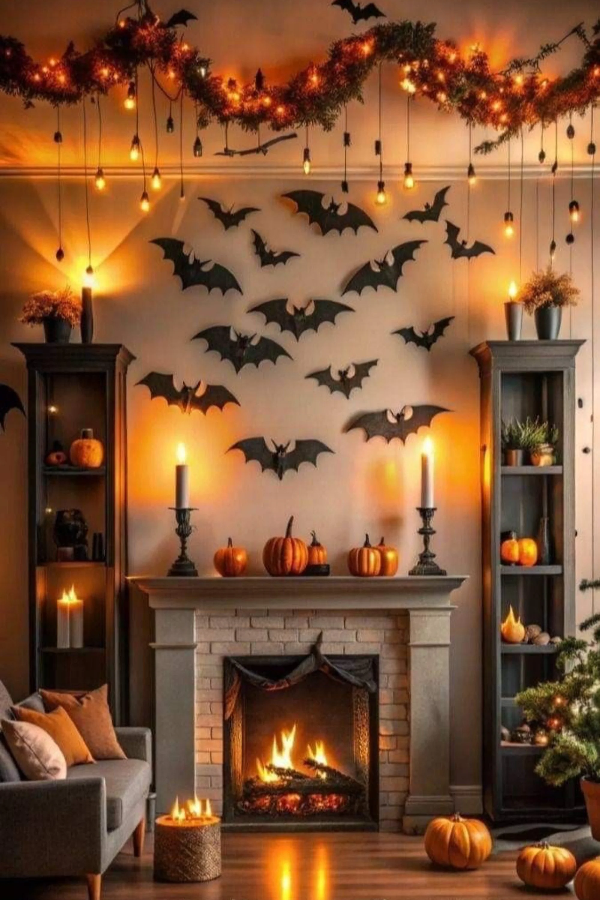 Use removable wall decals or cardstock bats to create a dynamic flying pattern above your mantel. Keep the mantel surface minimal with just a few pumpkins and candleholders. Frame the area with shelves or tall vases on either side, and string a garland overhead with warm lighting for ambiance.