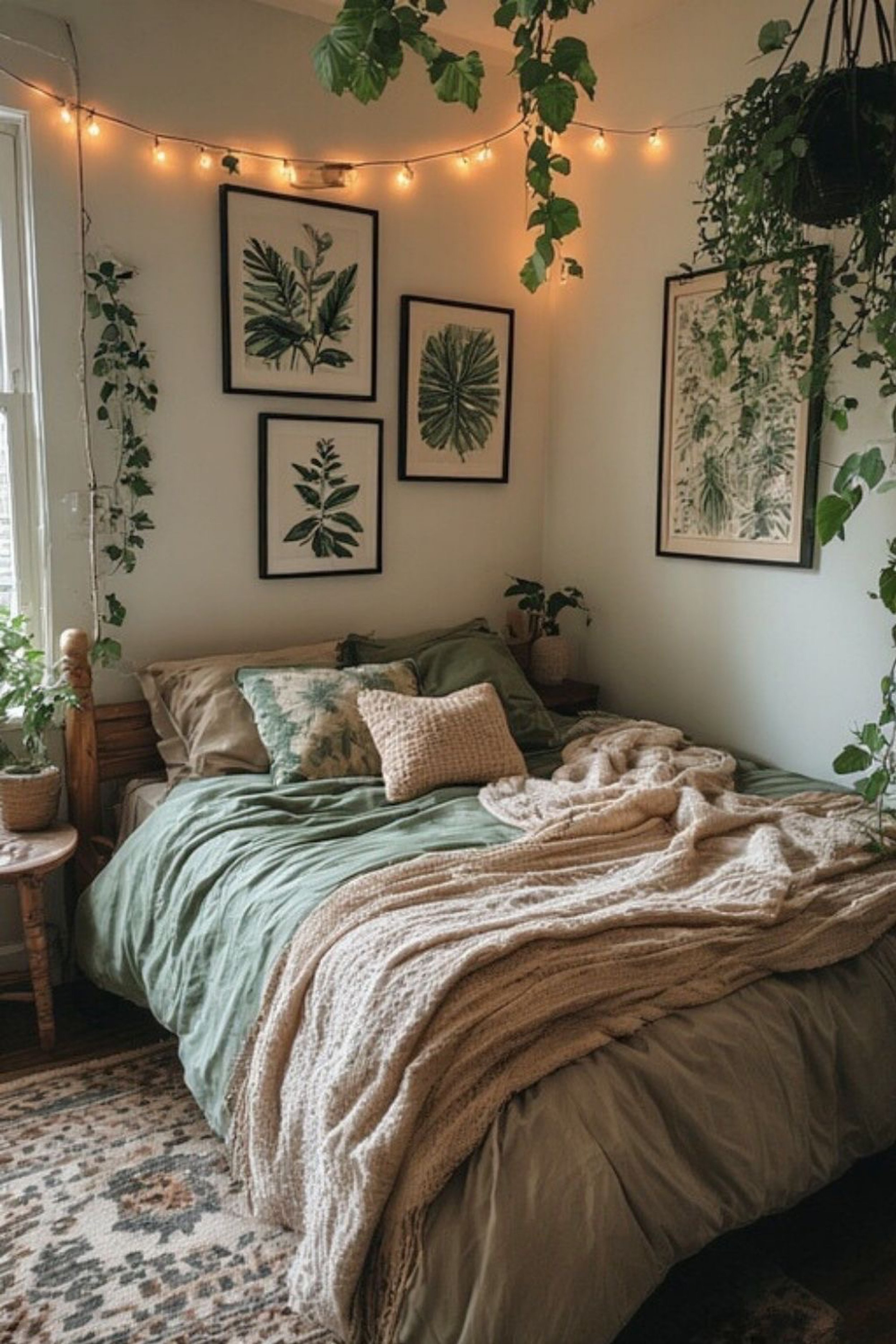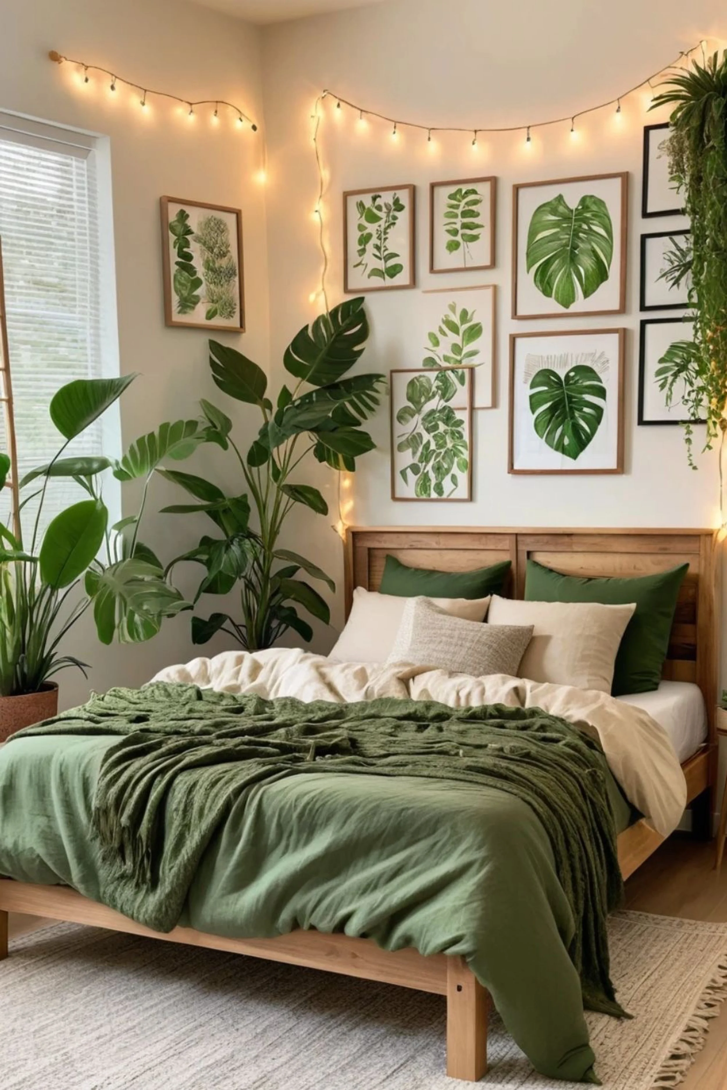 This bedroom feels like a curated art gallery of greenery, with framed botanical prints climbing the wall above a simple wooden bed. The sage duvet and green pillows echo the plant theme, while string lights wrap the corner, softening the bold arrangement with warmth. Large potted plants frame the bed, their broad leaves adding drama and freshness. The neutral rug keeps the space grounded, letting the wall art and plants shine. Together, the balance of structure and vibrancy creates a room that feels both natural and polished.
