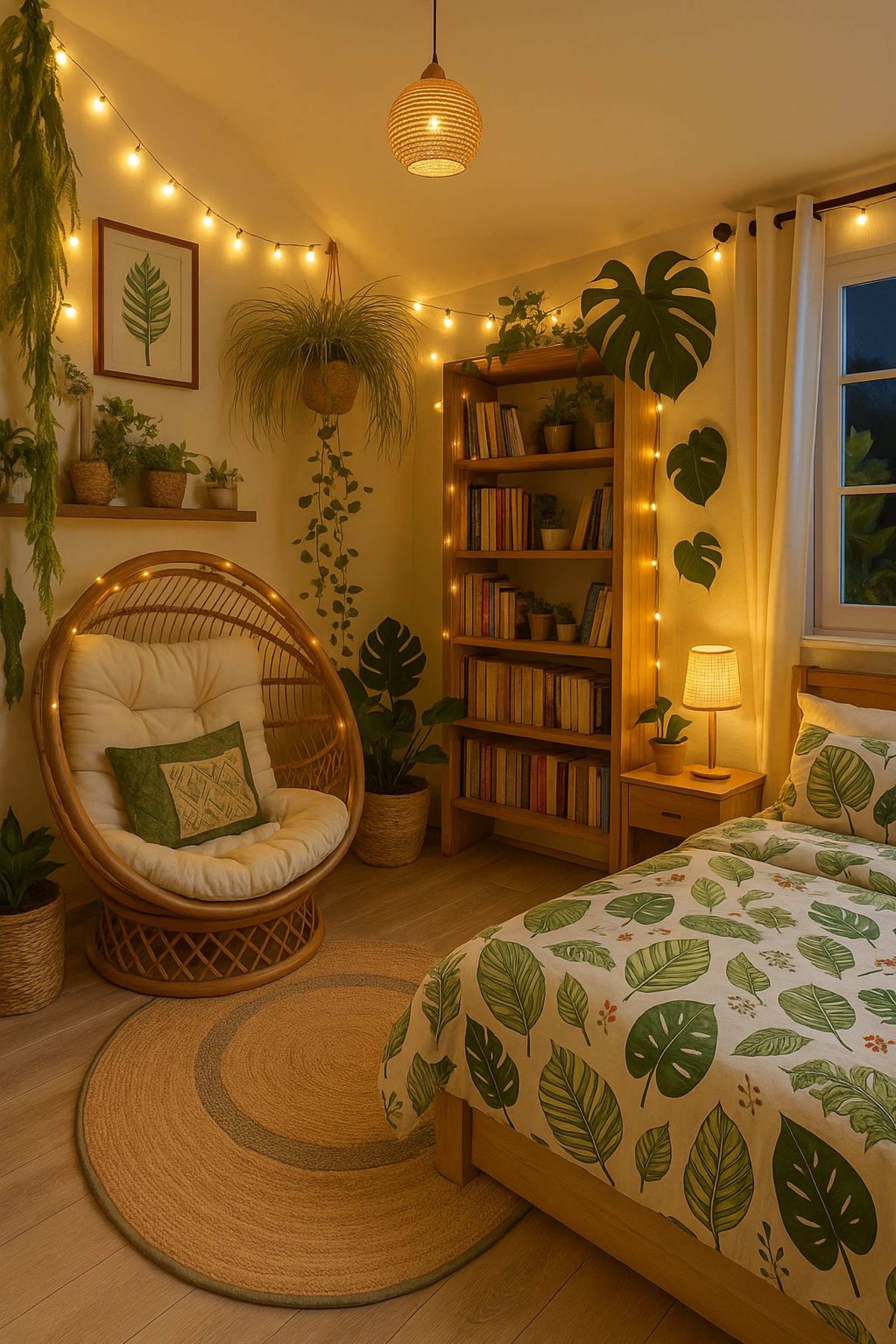 This bedroom glows with a warm, golden embrace, where leafy prints bloom across the bedding like a secret garden. String lights twinkle softly, wrapping the walls in a halo of amber, while a papasan chair beckons with its plush cushion, perfect for curling up with a book. Wooden shelves and a filled bookcase ground the space, their earthy tones balancing the playful light. Every corner whispers of nature — from hanging baskets to trailing plants — blending indoors with out. The circular woven rug centers the room, pulling together the round chair, warm textures, and leafy flourishes. It is a sanctuary of soft light and leafy dreams.