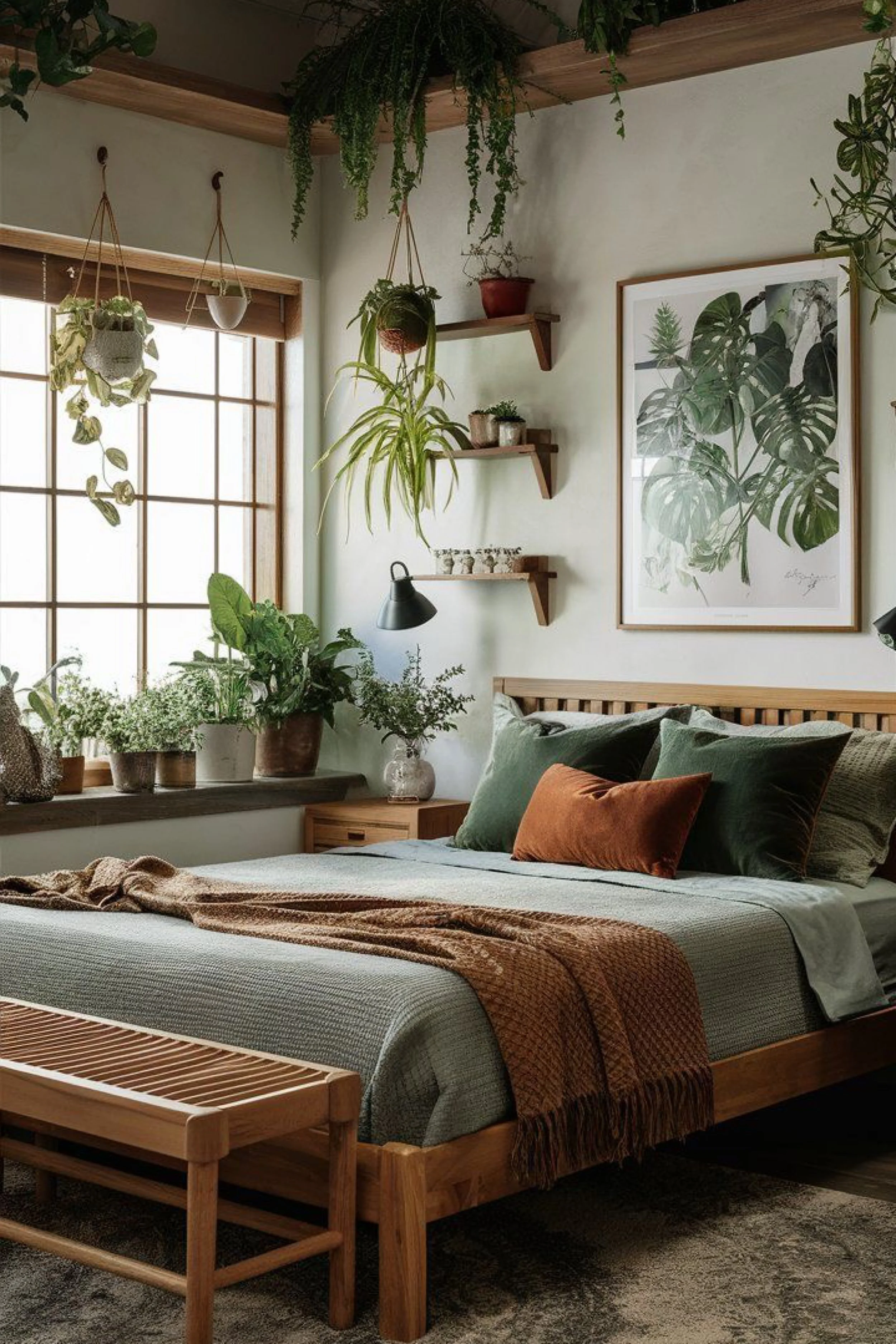 This bedroom blends earthy refinement with bohemian ease. A wooden bed with clean lines is dressed in muted sage bedding, accented by deep forest and rust-toned pillows. A caramel throw drapes across the bed, warming the palette. Above, hanging plants and shelves brim with greenery, softening the room’s structure. Botanical artwork framed neatly on the wall adds symmetry and story, grounding the organic touches with sophistication. Together, these details create a room that is balanced and earthy, calm yet characterful.