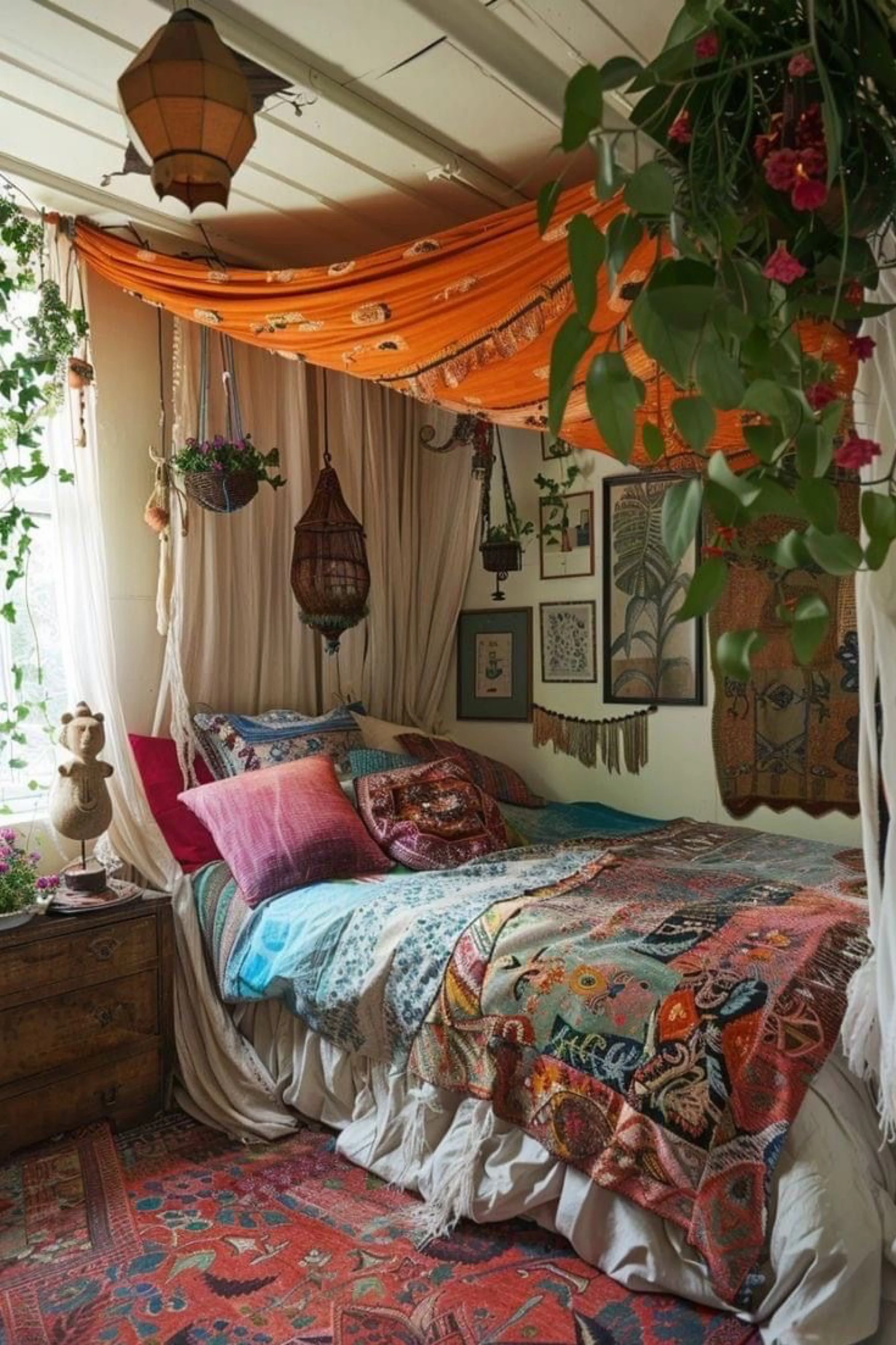 This boho bedroom bursts with wanderlust, wrapped in textiles that speak of faraway places. The bed is draped in layered quilts and blankets, rich with patchwork colors in ruby, teal, and gold. A canopy of orange fabric sweeps dramatically across the ceiling, bringing warmth and a sense of theatricality. Hanging lanterns and plants add depth and texture, while the eclectic mix of artwork and tapestries on the walls narrates a life full of stories. The space feels vibrant, collected, and deeply personal, a place where adventure and comfort meet in harmony.