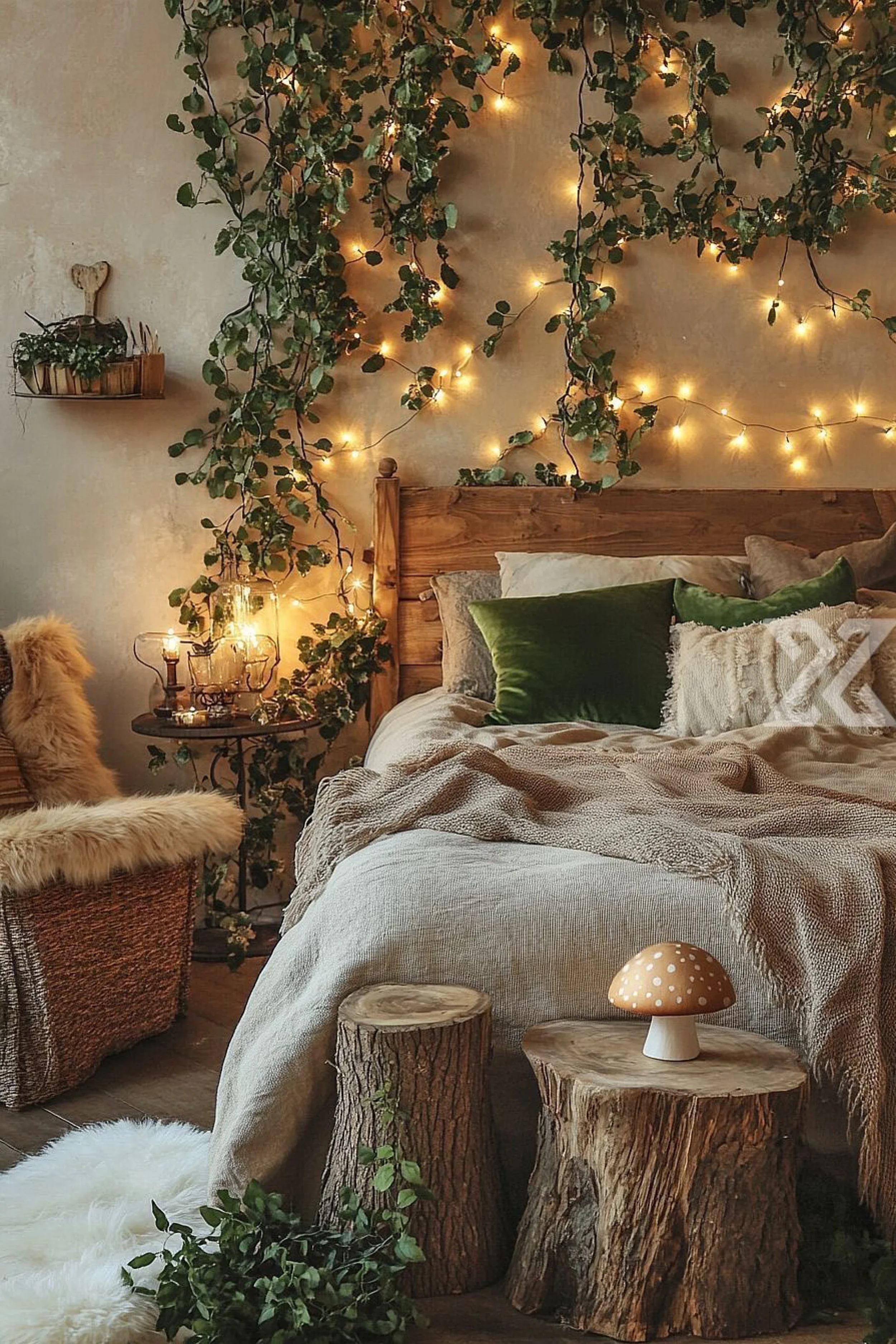 This bedroom feels like stepping into a woodland cottage at twilight. The walls glow with strands of fairy lights, woven around lush vines that tumble from above, creating a canopy of enchantment. A rustic wooden bed is layered with linen bedding and velvet cushions, earthy in palette yet soft to the touch. Tree-stump side tables stand as natural sculptures beside the bed, crowned with a whimsical mushroom lamp that adds magic to the mix. A woven chair draped in fur enhances the rustic charm, completing a room that is both earthy and ethereal.
