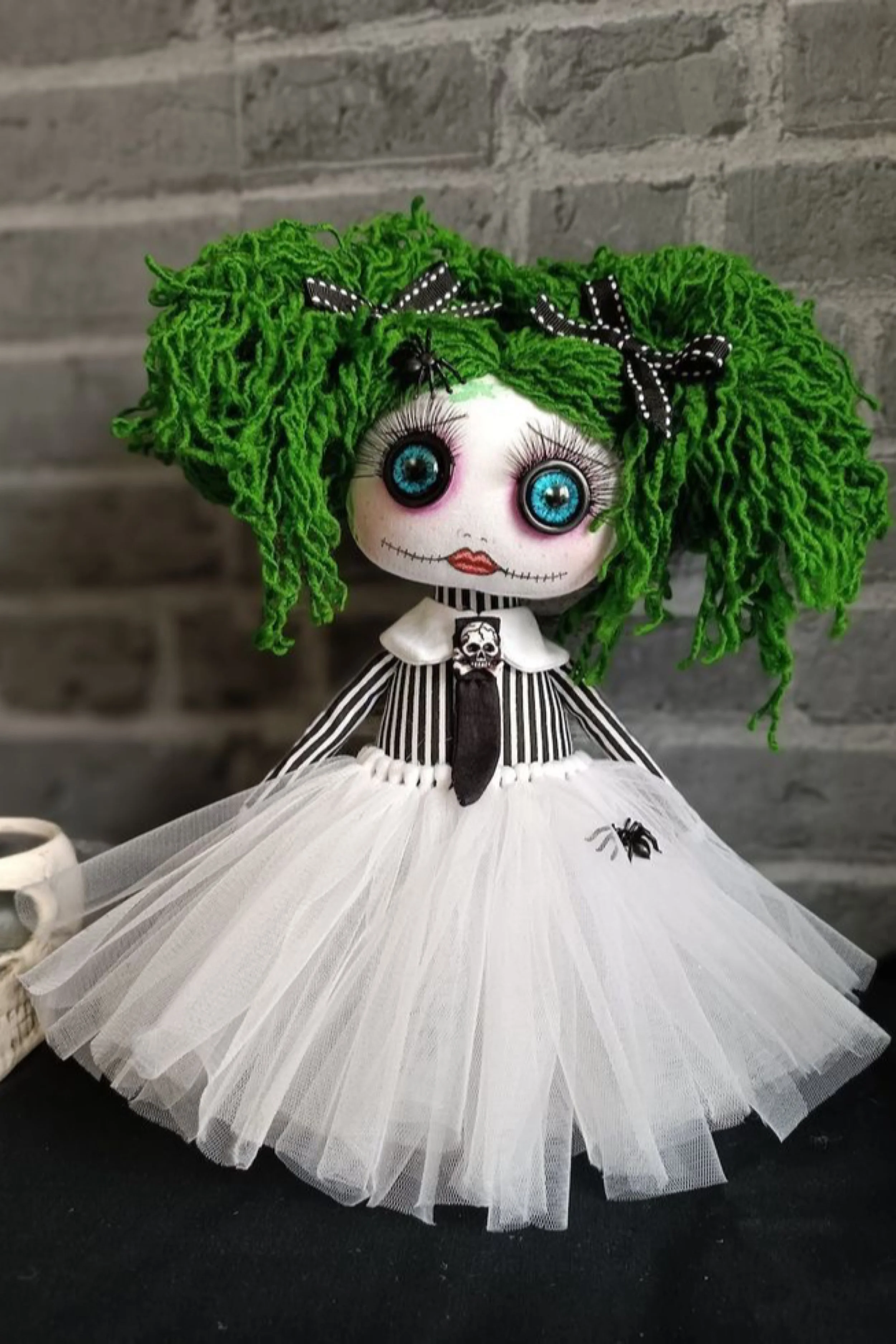 With wild green yarn hair tied into playful pigtails, this doll feels like she stepped straight from a quirky gothic fairytale. Her enormous blue button-like eyes are surrounded by painted lashes, her lips shaded in deep crimson, and stitched marks running across her pale face. A striped black-and-white blouse with a miniature skull tie blends formal with creepy, while a voluminous white tulle skirt adds ghostly lightness. A small black spider perched on her dress completes the ensemble, making her as eerie as she is enchanting. The contrasting black ribbons in her hair frame her face while her look balances Beetlejuice chaos with gothic elegance. She’s both doll and statement piece — strange, stylish, and unforgettable.