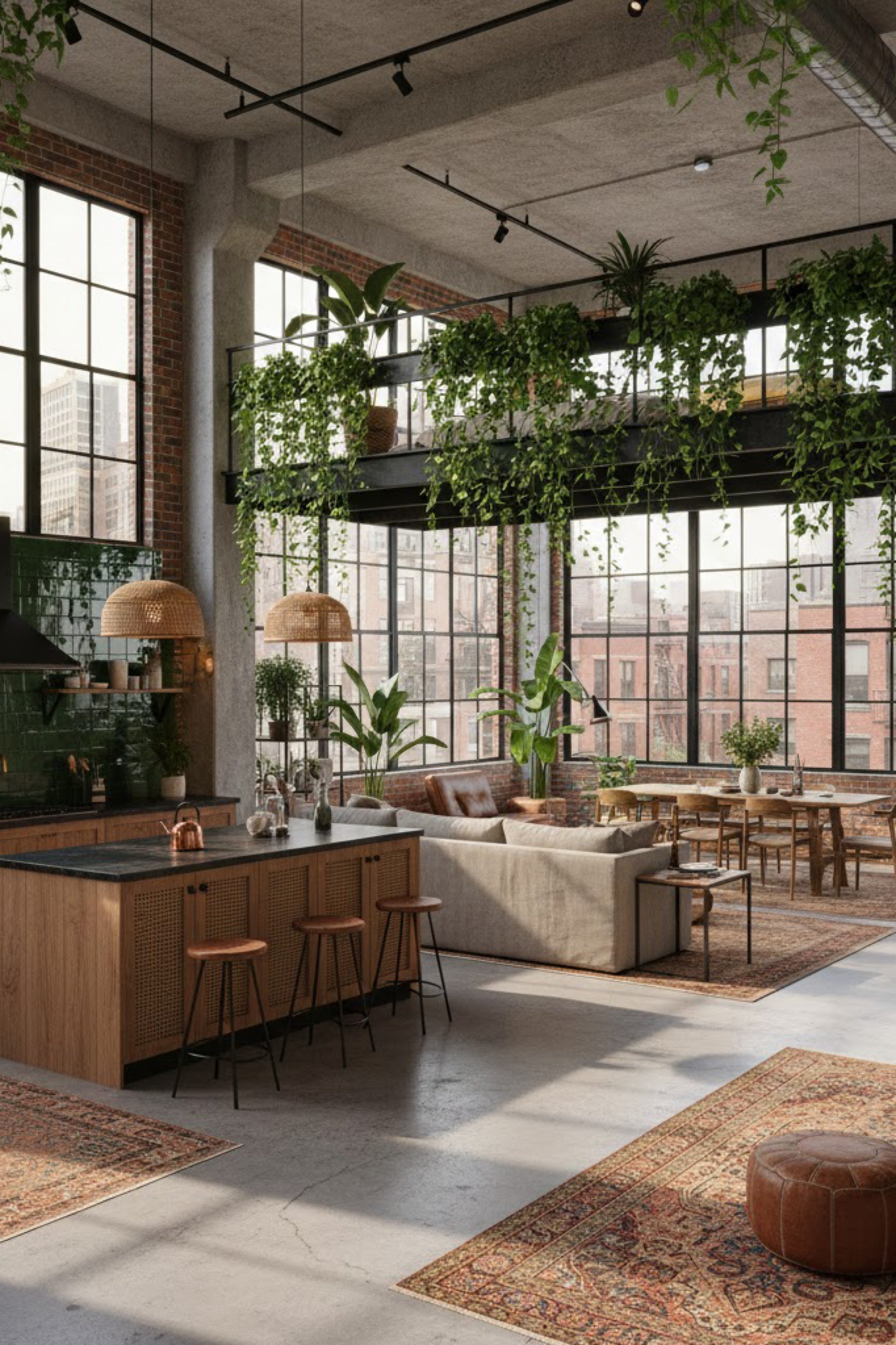 This loft reads like a bright gallery that decided to keep the brick, the steel, and the city view, then softened everything with plants. The windows wrap the room in daylight, making the greenery feel extra vivid and giving the furniture a clean, editorial presence. The kitchen island is simple and architectural, with warm wood and a dark top that feels grounded against all the glass. Two woven pendants bring a relaxed note and echo the natural textures scattered throughout the space. The mezzanine railing is treated like a living planter, with trailing vines creating a soft curtain line that frames the height of the room. A pale sofa keeps the living area calm and modern, while layered vintage rugs add soul and a sense of history. The brick walls and concrete ceiling keep the bones honest, but the styling shifts it into something serene and elevated. It is industrial loft living, but softened into a place that feels restorative instead of stark.