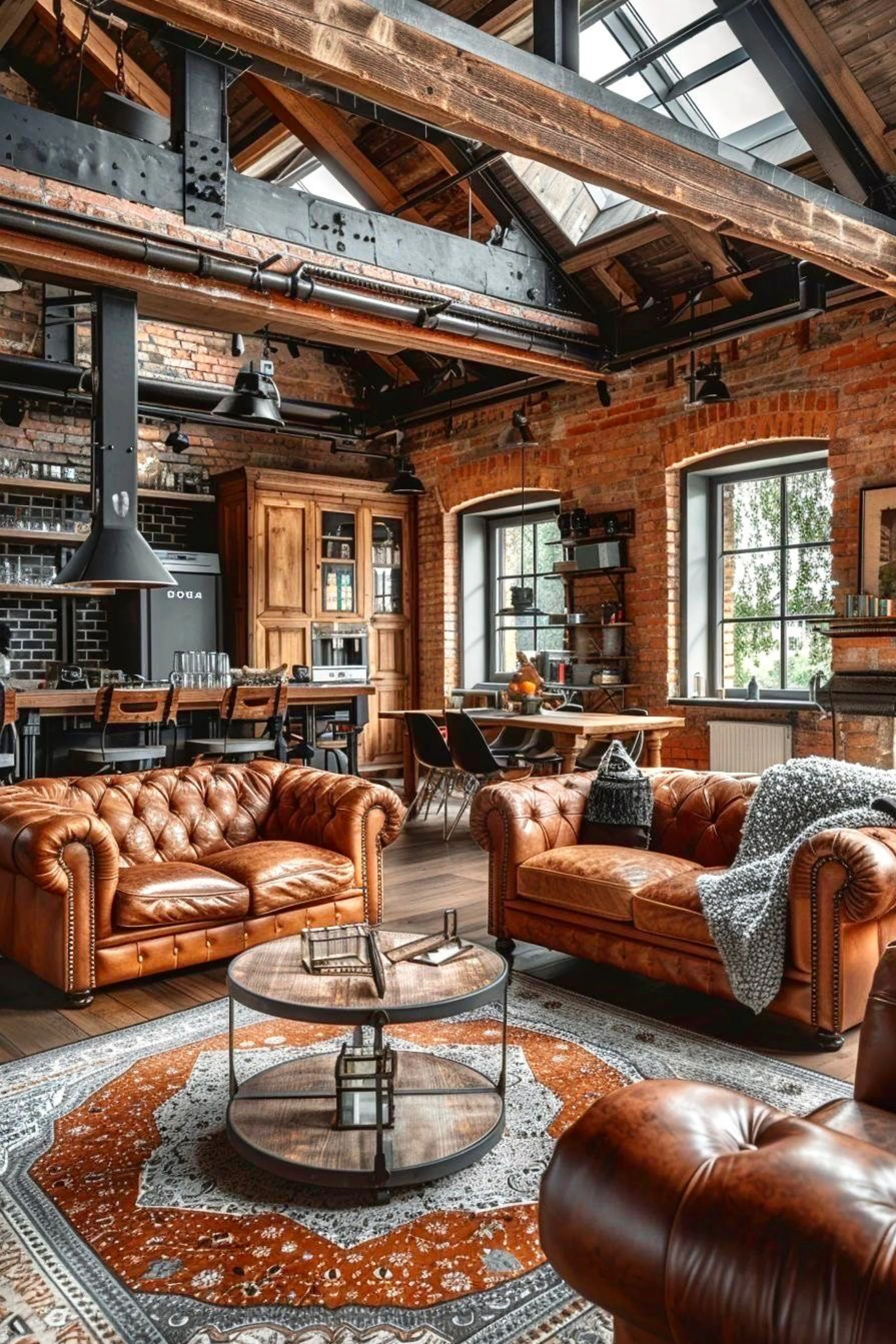 This loft feels like a heritage space that has been upgraded with modern comfort but kept its original soul. Heavy wood beams and steel hardware cross the ceiling with a sense of permanence, and skylights bring in clean daylight that makes the brick glow warm instead of dark. Two tufted leather sofas create a classic seating moment, rich and inviting, while the round coffee table keeps the center soft and social. The kitchen and dining area sit in the background like part of the same scene, with black accents, warm wood cabinetry, and industrial lighting that feels purposeful. The rug beneath the seating is bold and traditional, grounding the space and making it feel established from day one. Everything here is about texture and craft: worn leather, aged brick, raw beams, and metal details that read authentic. It is cozy, bright, and quietly luxurious, like a space designed to last.