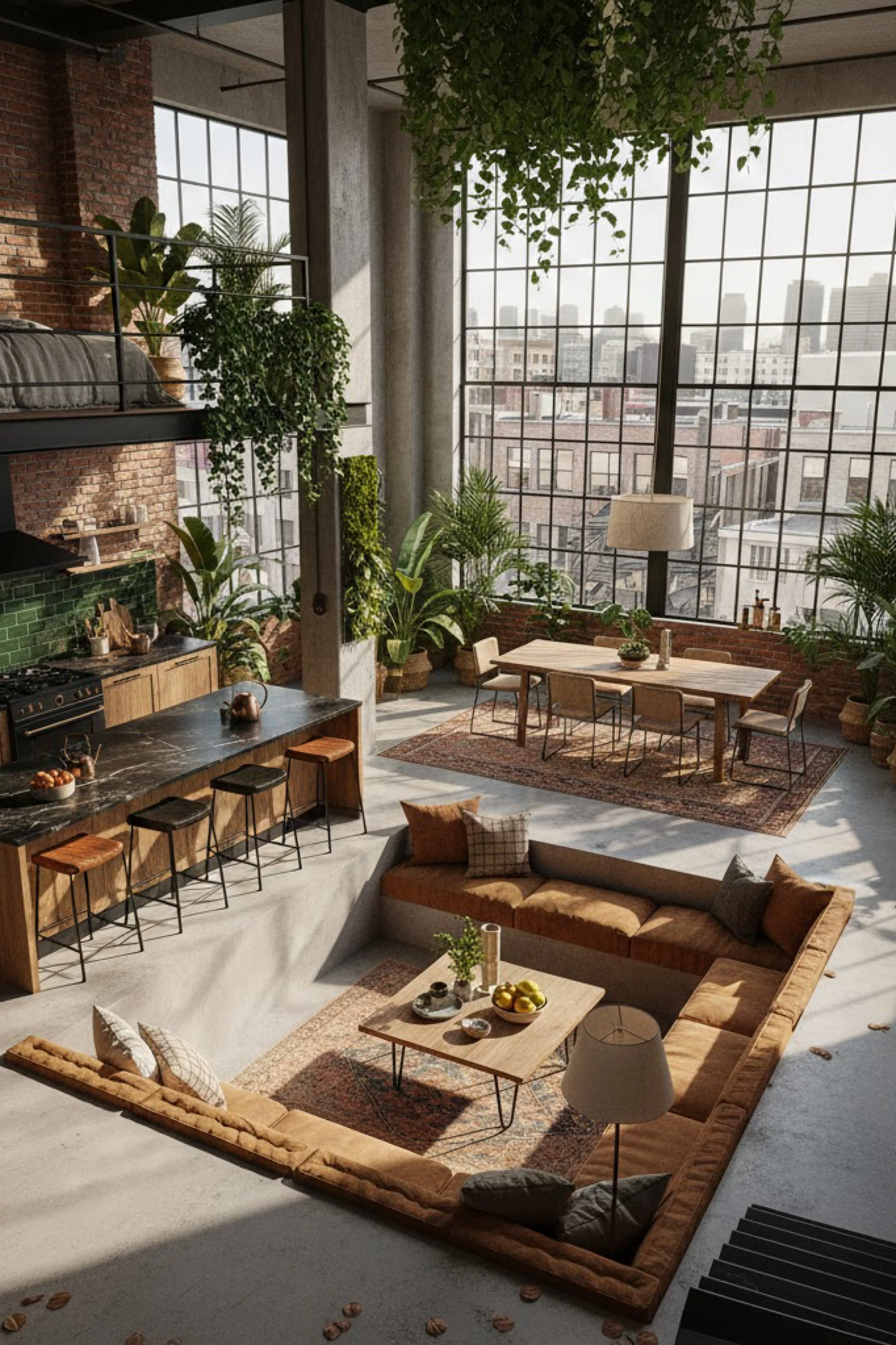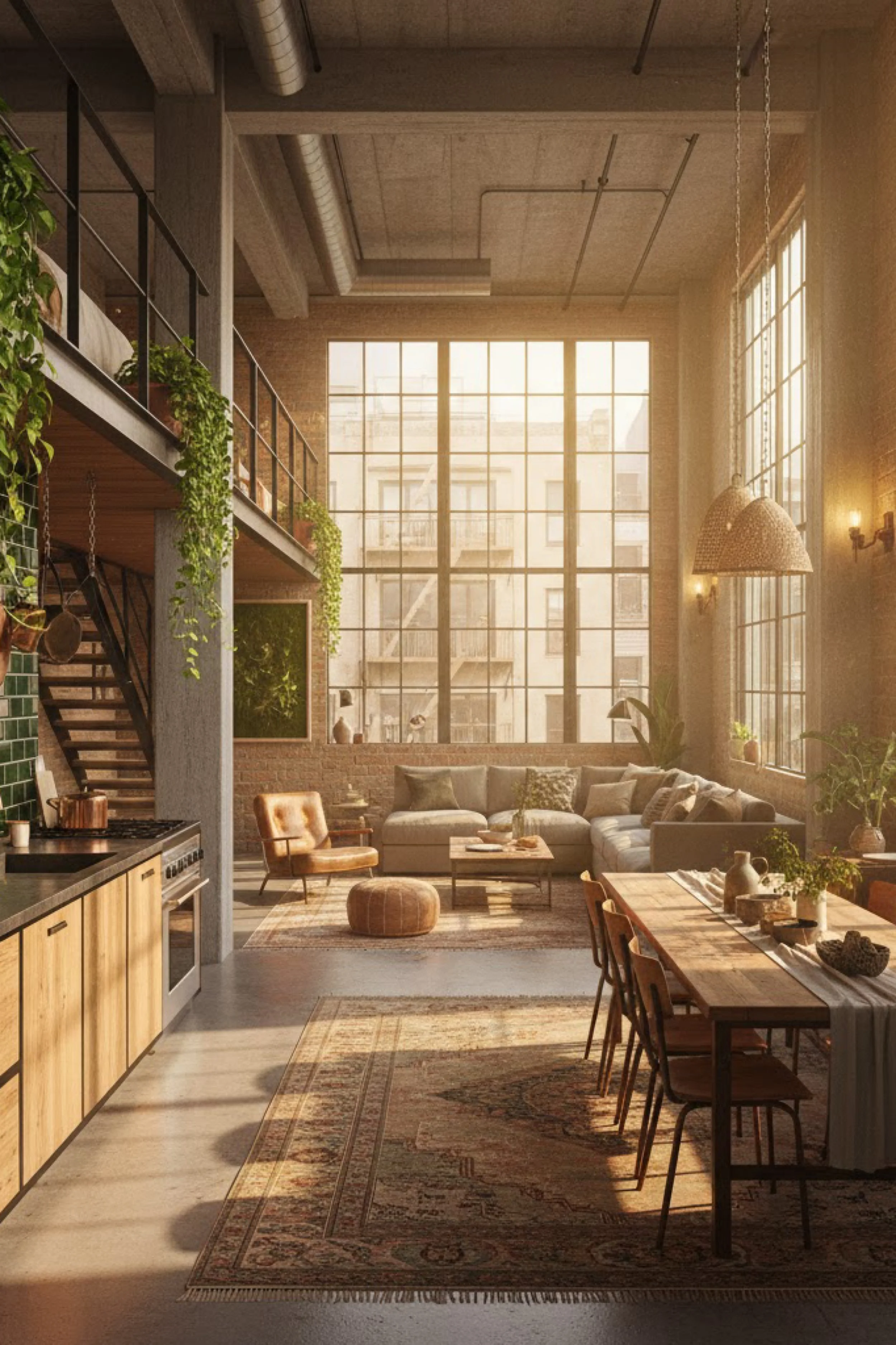 This space feels like it was designed for late afternoon, when the sun turns the brick walls into honey and every surface looks touchable. A massive grid window acts like a mural, pulling the city into the room without stealing the calm. The kitchen runs along one side in warm wood and black stone, practical but still beautiful, while the dining table sits in the sunbeam like it was placed for long dinners and slow mornings. A lofted mezzanine adds vertical drama, and the cascading greenery on the railing makes the structure feel alive instead of industrial. The seating area is relaxed and layered, with a roomy sectional, textured pillows, and a vintage rug that gives the room its soul. Woven pendants and small wall lights create a soft glow that complements the daylight rather than competing with it. Everything reads curated but not precious. It is an urban retreat built on warmth, texture, and a steady rhythm of plants, wood, and light.