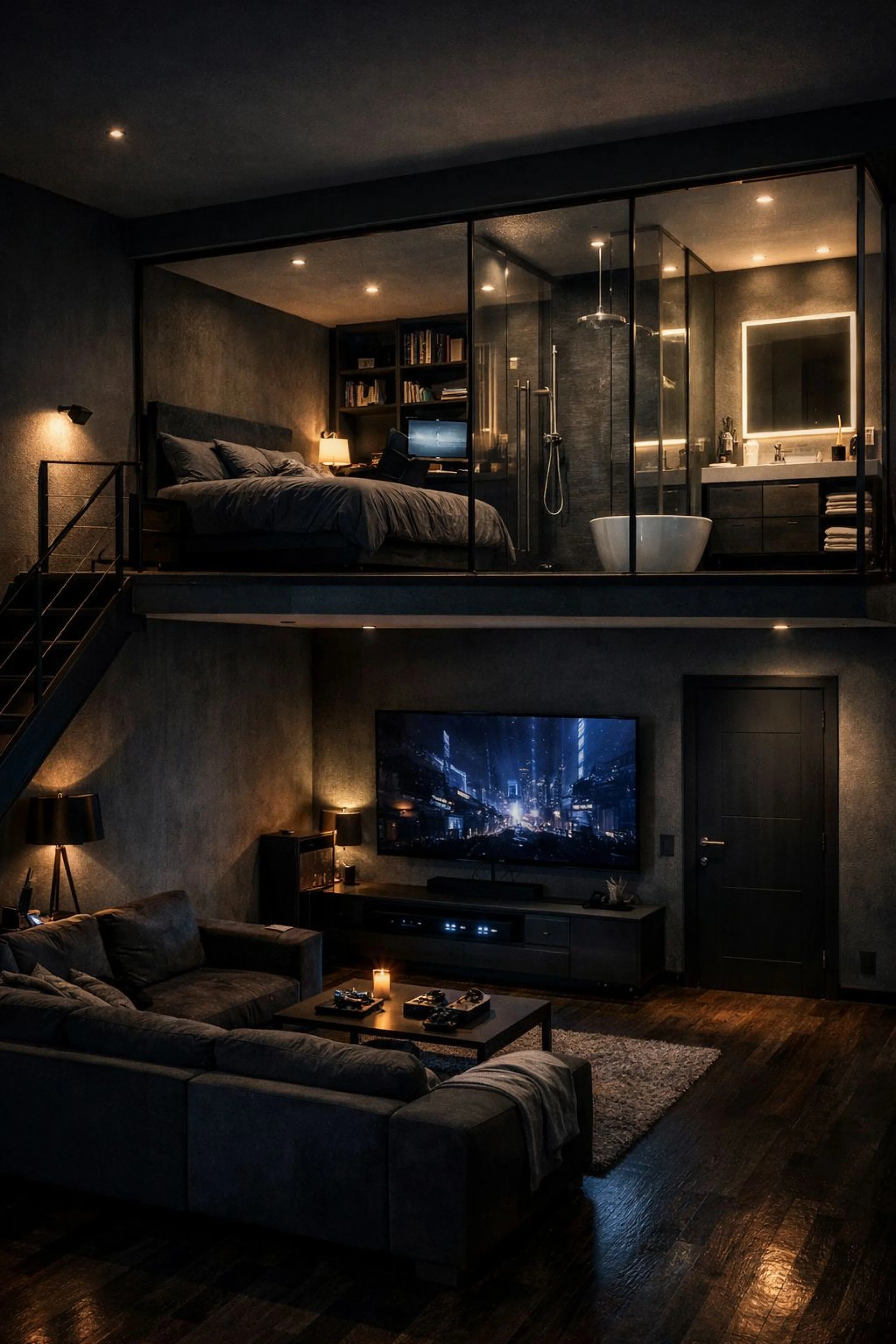 This loft is pure night mode luxury, quiet, minimal, and built around atmosphere. The palette is nearly monochrome, with deep charcoal walls, matte black doors, and dark wood floors that feel velvety under low light. A floating mezzanine holds the bedroom like a private suite, separated by glass so the space stays open while still feeling defined. The bathroom glows behind the glass with soft, hotel level lighting, turning everyday routines into a cinematic ritual. Downstairs, the living area is designed like a personal screening room: a plush sectional, a low media console, and warm points of light from lamps and candles that keep the darkness inviting rather than heavy. The styling is restrained, but rich. Texture does the talking: soft upholstery, subtle wall finish, and reflective glass that catches light without turning glossy. It is modern, controlled, and intimate, the kind of loft that makes the city feel far away even when it is right outside.