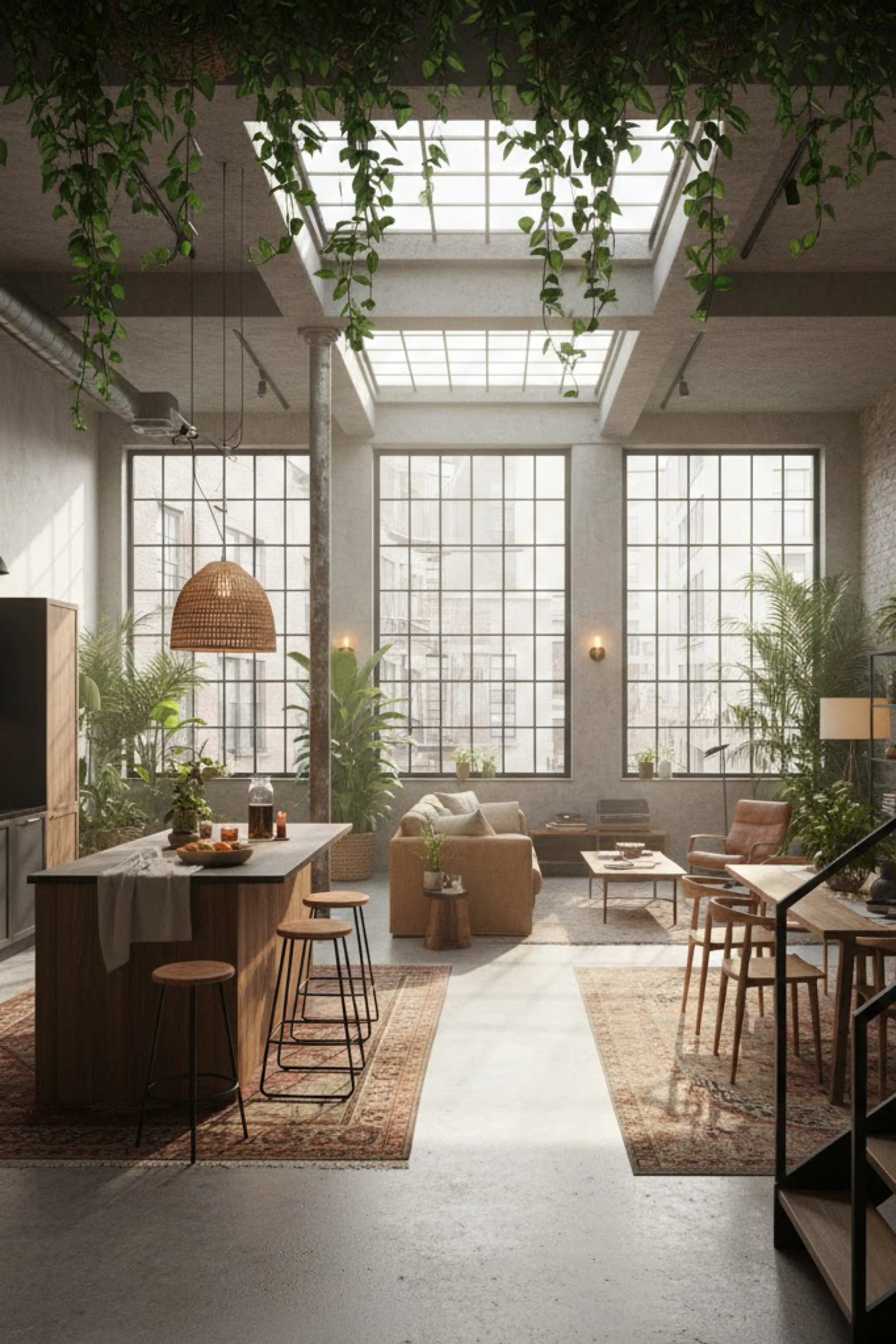 This loft feels like a greenhouse built inside an old factory shell, where daylight pours in from above and the whole room breathes. Two oversized skylights and grid windows turn the space into a soft light studio all day, while the concrete floor keeps everything grounded and modern. Hanging vines frame the ceiling like living drapery, adding movement without clutter. The palette stays quiet and elevated: warm wood, woven textures, creamy upholstery, and a few earthy accents that echo the rugs. A rattan pendant over the island adds a hand made note that softens the industrial bones, and the open layout is carefully zoned so it reads as intentional, not empty. The kitchen feels social and sculptural, with stools that keep the sightlines clean. Plants are doing the heavy lifting here, but it never feels chaotic. Instead, the greenery becomes the architecture, balancing the hard edges of steel, brick, and glass with a relaxed, sunlit confidence.