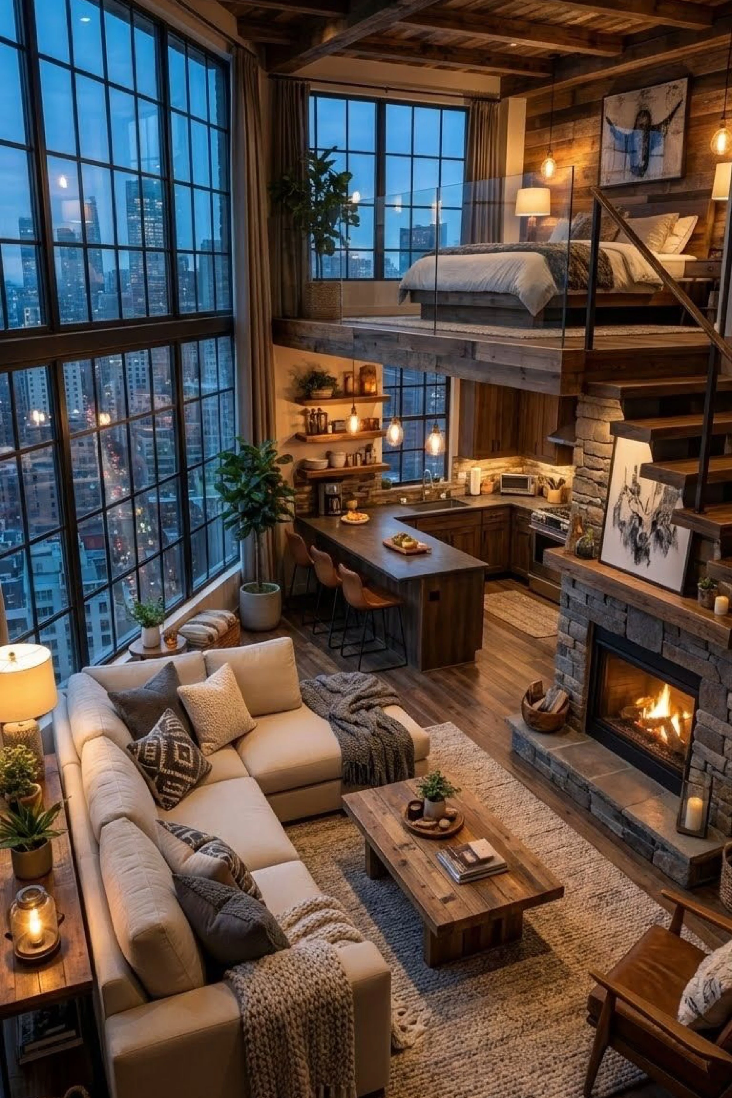 This loft captures that blue hour magic when the city turns into a sea of lights and your home feels like a lookout. Towering factory windows frame the skyline like a movie, while the interior stays warm and grounded with wood beams, soft lamps, and a stone fireplace that adds instant comfort. The living area is calm and tactile: a creamy sectional, chunky throws, and a low rustic coffee table that feels like it belongs in a cabin, not a high rise, in the best way. The kitchen is tucked behind with warm wood cabinetry and pendant lights that glow like small moons, making the space feel intimate despite the scale. Above it all, the bedroom loft sits behind glass railing, airy and serene, like a private suite floating over the city. The mix of materials is the secret: industrial windows, rustic wood, stone, and soft textiles, all working together to make the space feel both dramatic and deeply livable.