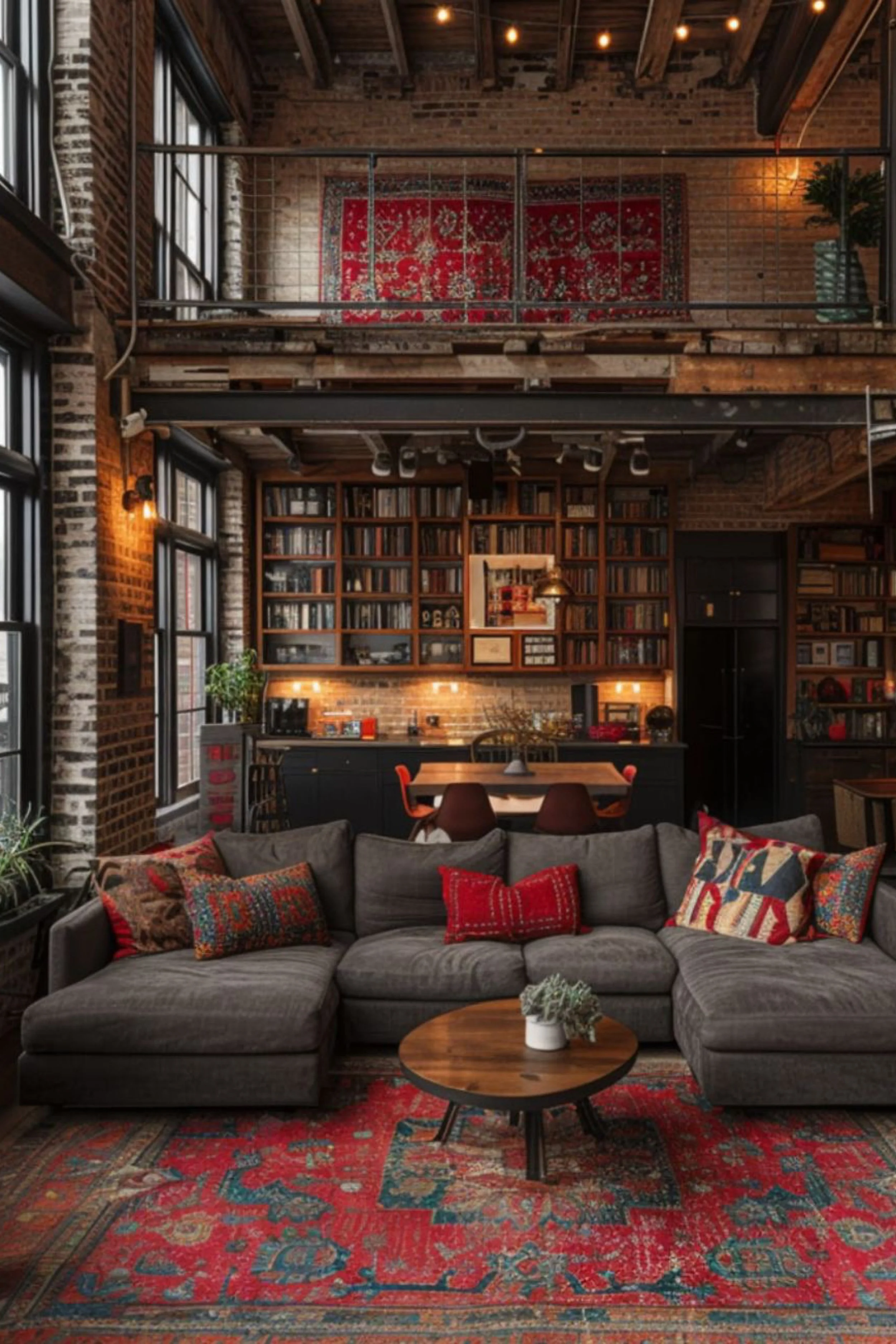 This loft is a love letter to books, brick, and color. A full wall of shelving turns the kitchen zone into a library backdrop, making the whole space feel collected and personal. The ceiling beams and steel mezzanine keep the industrial bones visible, while warm under cabinet lighting and soft string style ceiling lights bring a gentle glow that reads cozy instead of warehouse. The living area is anchored by a deep gray sectional that invites sprawl, dressed with patterned pillows and red accents that echo the bold vintage rug underfoot. There is something cinematic about the mix: brick, black cabinetry, warm wood, and those saturated reds that make the room feel alive. The layout is open, but it feels layered, like each area has its own mood. It is equal parts creative studio and hosting space, the kind of loft where dinner turns into a late night conversation because the room feels like a story you want to stay inside.