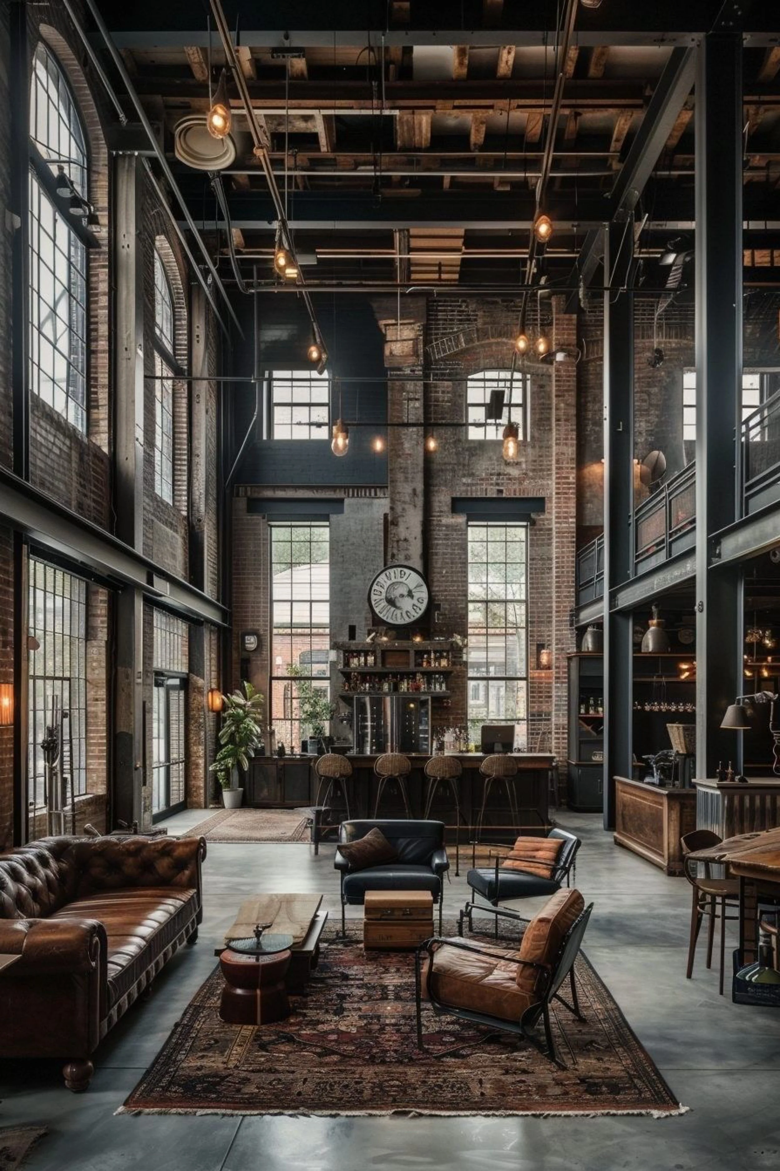 This is the kind of loft that makes you stop mid sentence, because the scale is unreal. A true foundry hall vibe with soaring height, massive steel columns, and arched factory windows that read like architecture, not just glazing. The palette stays masculine and clean: iron, brick, concrete, and dark wood, with warm leather bringing life and softness. The bar area becomes the visual anchor, with tall stools and a back wall that feels like a boutique hotel lounge, topped by an oversized industrial clock that gives the room a little theater. Seating is arranged like a conversation club rather than a living room, with leather, metal frames, and a low table that encourages drinks and long talks. Pendant lights hang at varied heights like floating sparks, giving the huge volume warmth and rhythm. Despite the openness, it feels designed for gatherings, not echo. It is gritty, polished, and confident, the kind of space where you host once and everyone asks when the next night is happening.