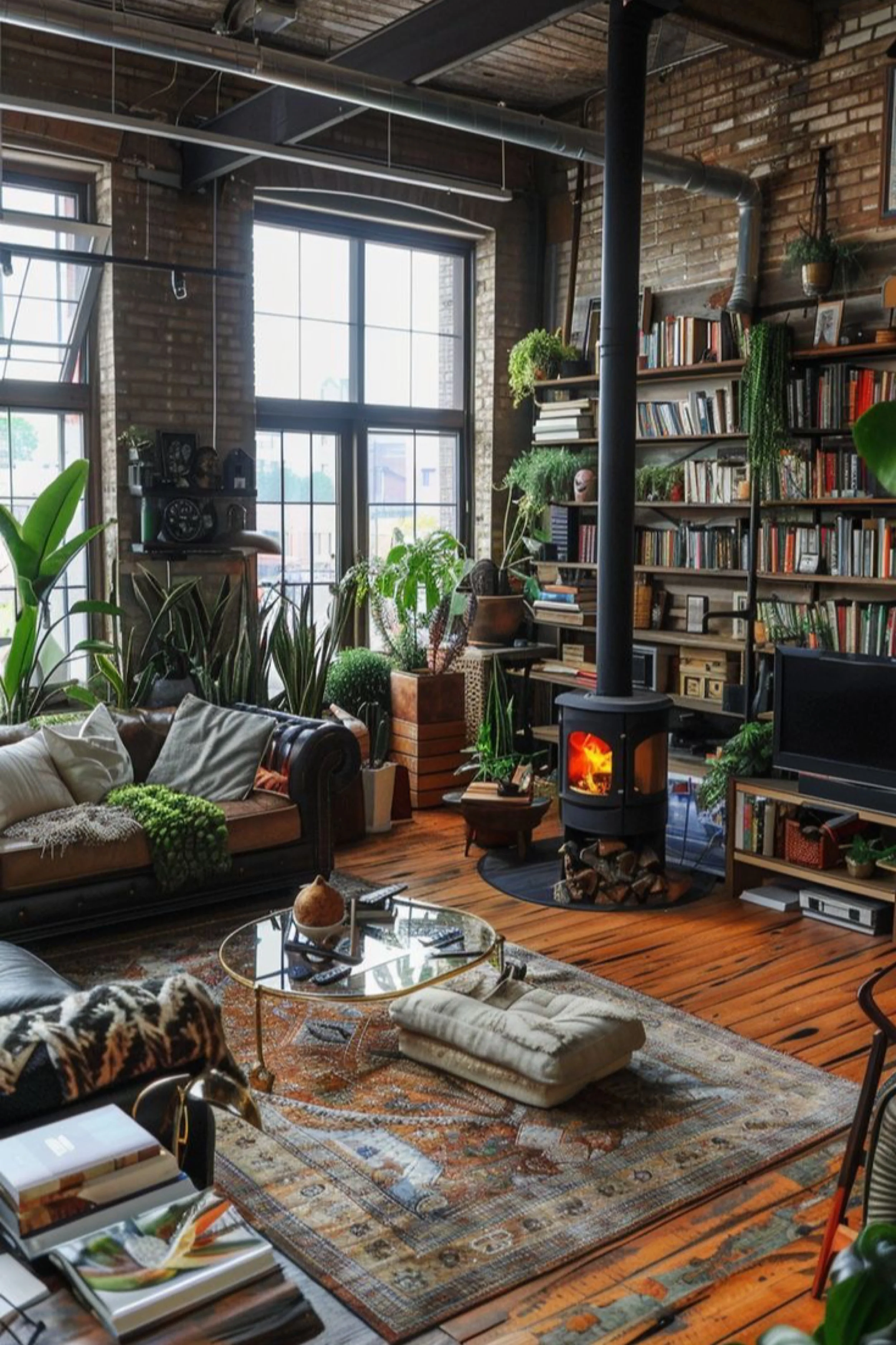 Let the books be the color and pattern, then keep furniture shapes simple. Choose shelving that runs wall to wall and mix vertical stacks with horizontal piles so it looks curated rather than staged. Use warm wood tones on the floor and bring in one large rug with a vintage pattern to soften the industrial edges. For the stove area, add a small wood basket and a simple hearth mat so it feels intentional and safe. Layer greenery in three heights: floor plants near windows, mid height plants on stands, and trailing plants on top shelves. Keep the coffee table reflective or glass to prevent the room from feeling heavy with all the books. Use warm bulbs in lamps and add one reading lamp near the sofa. If you want extra cohesion, repeat black metal elements in small doses, a lamp base, shelf brackets, or plant stands, to tie back to the ductwork and window frames.