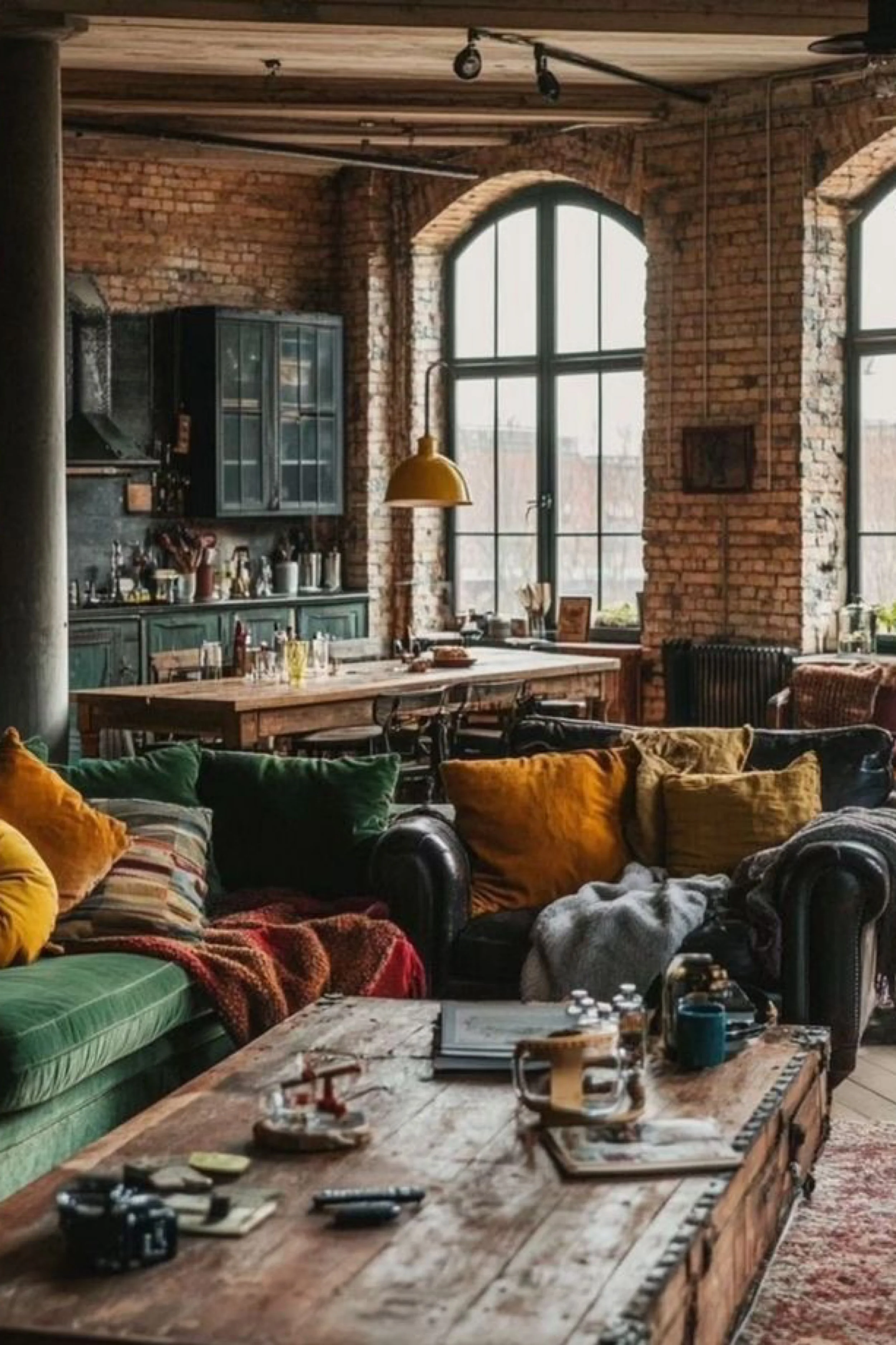 This loft feels lived in, creative, and genuinely cozy, like a workshop studio that learned how to host. The brick walls and arched windows bring instant character, and the kitchen leans classic industrial with deep green cabinetry and a long communal table that doubles as prep space, homework station, and gathering spot. The living area is the heart: worn leather, mixed textiles, and a pile of pillows in mustard, forest, and rust that makes the whole room feel warm even on gray days. A chunky wood coffee table grounds the space with real weight and texture, covered with small everyday objects that make it feel honest instead of staged. The lighting is simple but golden, emphasizing the grain of the wood floor and the soft patina of the brick. It is the kind of loft that smells like coffee and sounds like vinyl. Comfortable, slightly messy in a charming way, and built for slow mornings that turn into late nights.