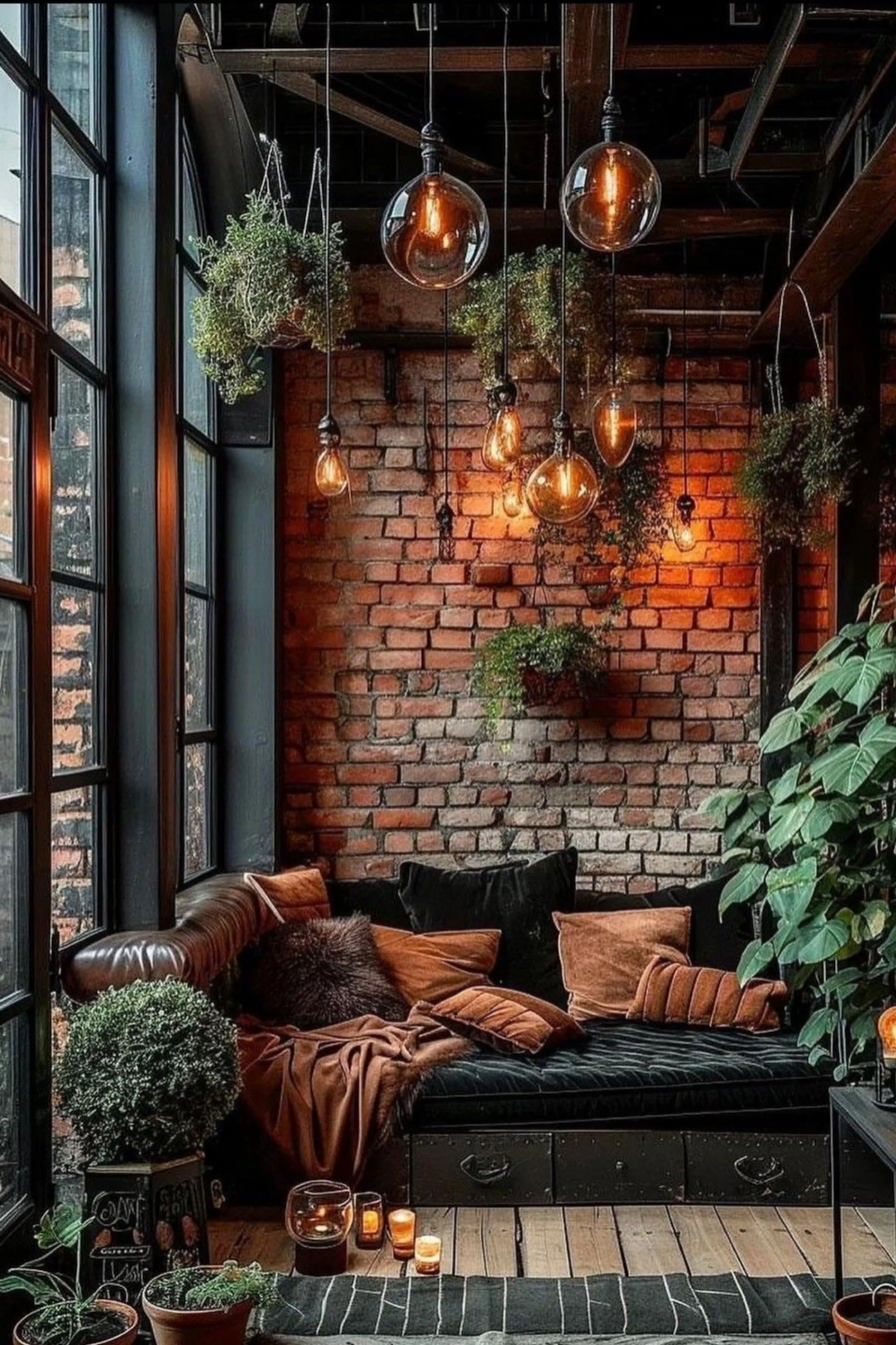 This corner loft feels like a secret room built for exhaling. Floor to ceiling windows frame the city in soft gray light, while the interior answers back with warmth, velvet, and a slow glow of amber pendants. The brick wall is the backbone, textured and imperfect in the best way, and the lighting turns it into a sunset surface even at night. A low, dark daybed sofa stretches along the wall like an invitation to cancel plans, piled with rust toned pillows that look like dried leaves and worn suede. Hanging plants float overhead, softening the steel beams and making the space feel more like a conservatory than a warehouse. On the floor, small candles gather near the seating like a ritual, adding sparkle without breaking the mood. It is intimate, layered, and a little cinematic, the kind of place where music sounds better and conversations last longer because the room keeps you there.