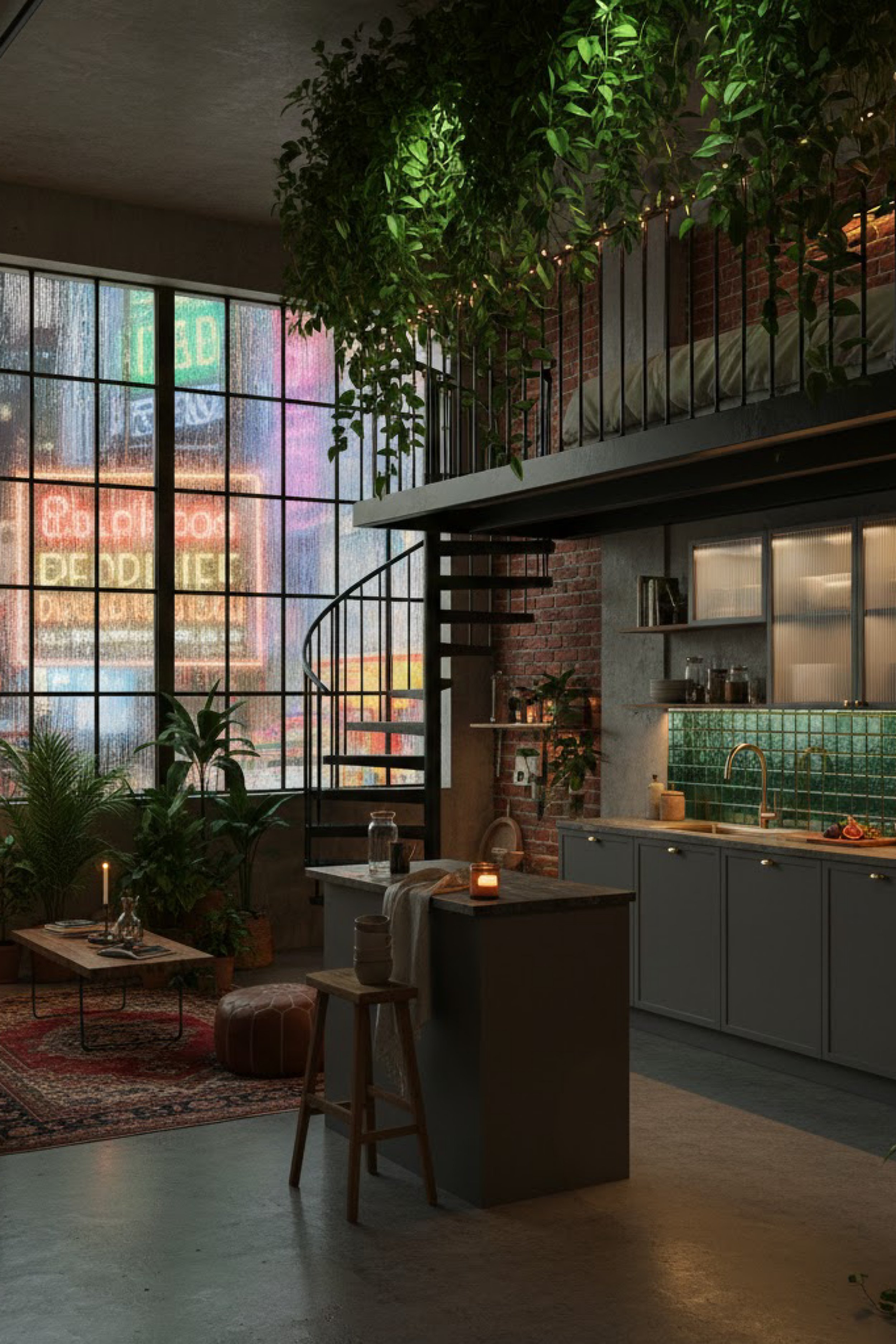 This loft flips the usual bright loft narrative into something moodier and cinematic. The giant industrial window becomes a glowing backdrop, with color bleeding through like city signage in the rain. Brick walls and a dark metal mezzanine give the space a nightclub edge, but the styling brings it back to intimate and livable. The kitchen feels sleek and grounded, with deep cabinetry, a green tile backsplash that adds jewel tone richness, and warm brass moments that keep it from going cold. The spiral stair reads like sculpture, pulling your eye upward into the sleeping loft while vines spill over the edge like a living canopy. Low lighting, candles, and small pools of glow make the room feel like an evening destination even on a weekday. Plush rugs soften the concrete floor, and the seating area stays simple, focusing on comfort and atmosphere instead of clutter. It feels like a private hideout where you can host, unwind, and let the city soundtrack stay outside the glass.