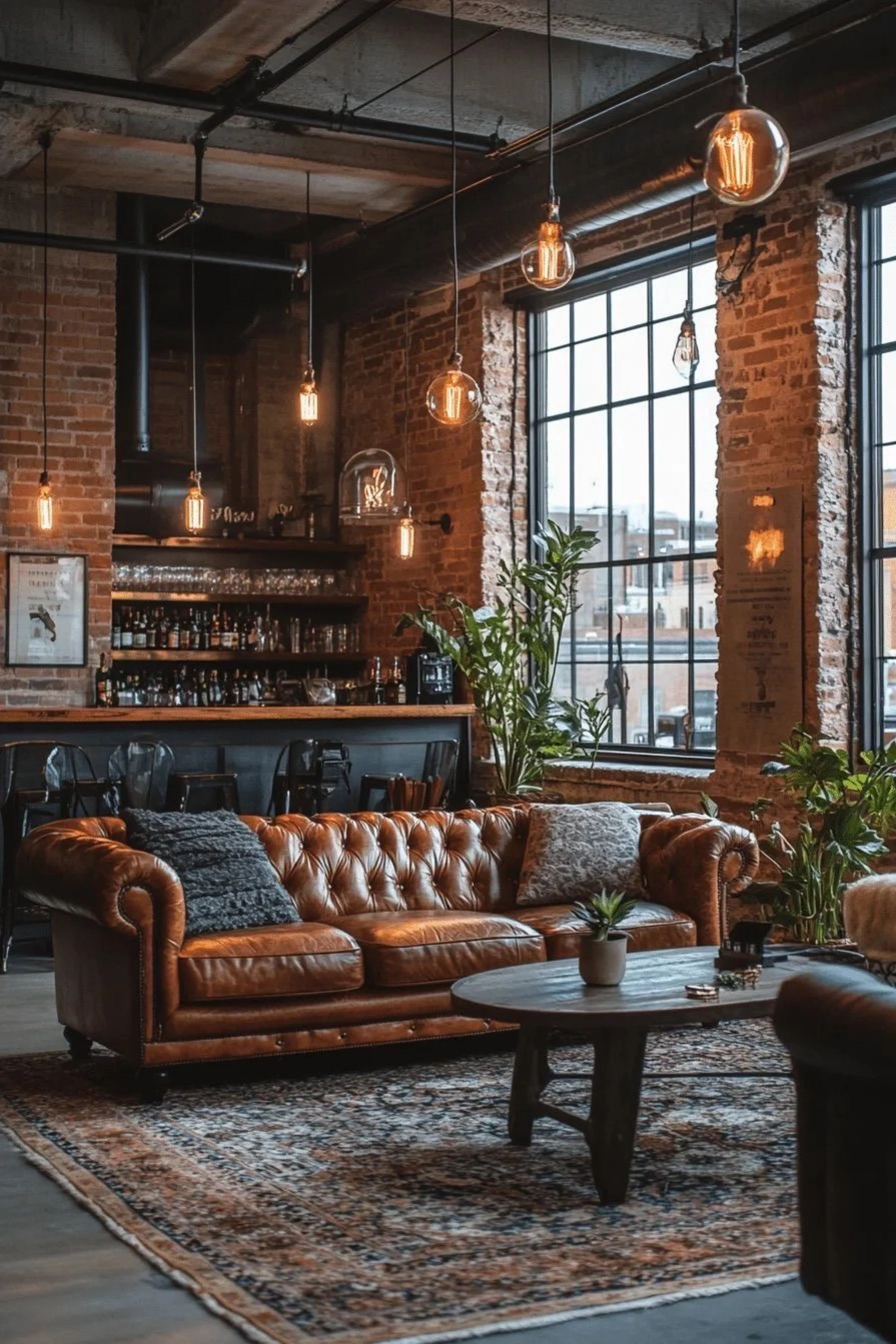 This loft feels like a private bar that happens to include a living room. Exposed brick, black steel, and a wall of bottles create instant atmosphere, while the huge factory window keeps it from feeling closed in. Hanging globe pendants with warm filament bulbs float above the space like amber bubbles, giving the room a steady glow that reads high end and intimate. A tufted leather sofa sits front and center, classic and inviting, anchored by a patterned rug that adds texture without competing with the bar wall. The layout is social by design, with bar seating behind the sofa so guests can drift between cocktails and conversation without awkward traffic. Plants add softness and a touch of green relief against all the brick and metal, keeping the mood luxe rather than harsh. It is polished, warm, and made for hosting, the kind of loft where a simple night turns into a long one because the space makes staying feel easy.